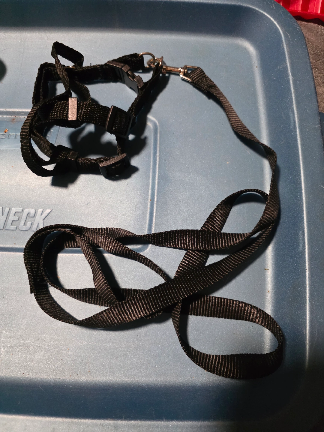 Selling a black harness and leash set. It's in good condition and ready for walks with your furry friend! Leash used a few times but harness is new.