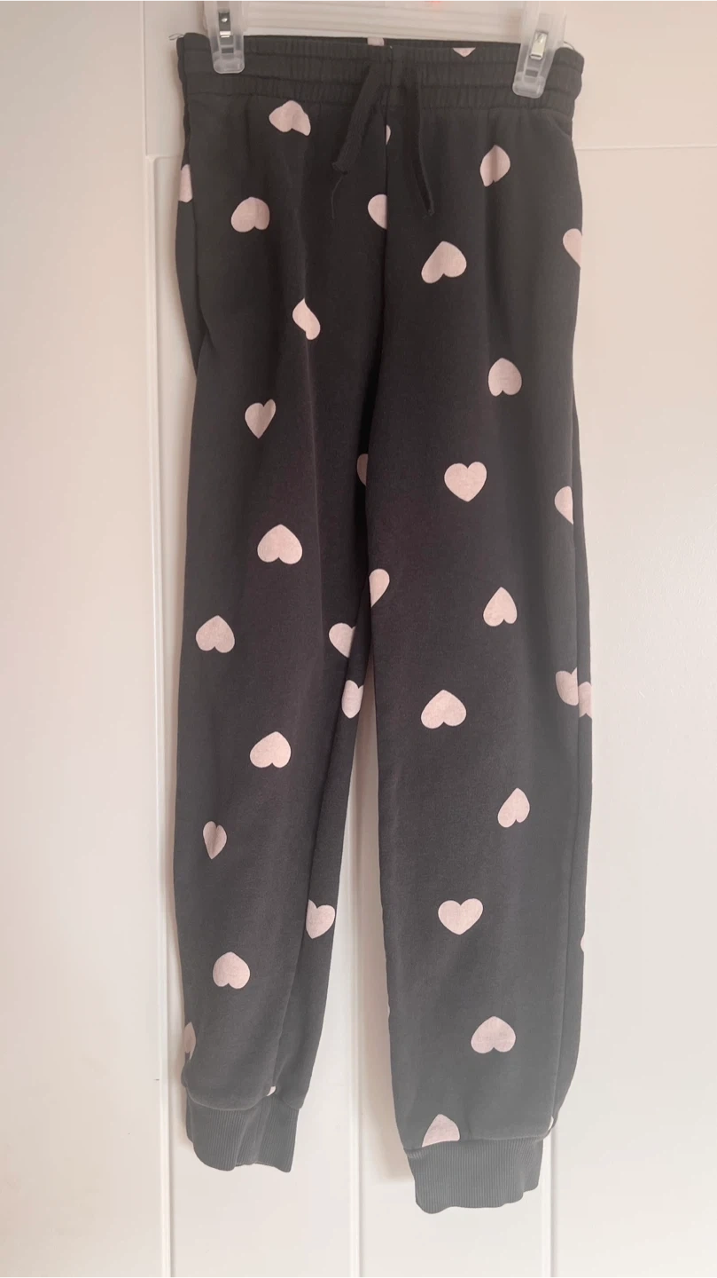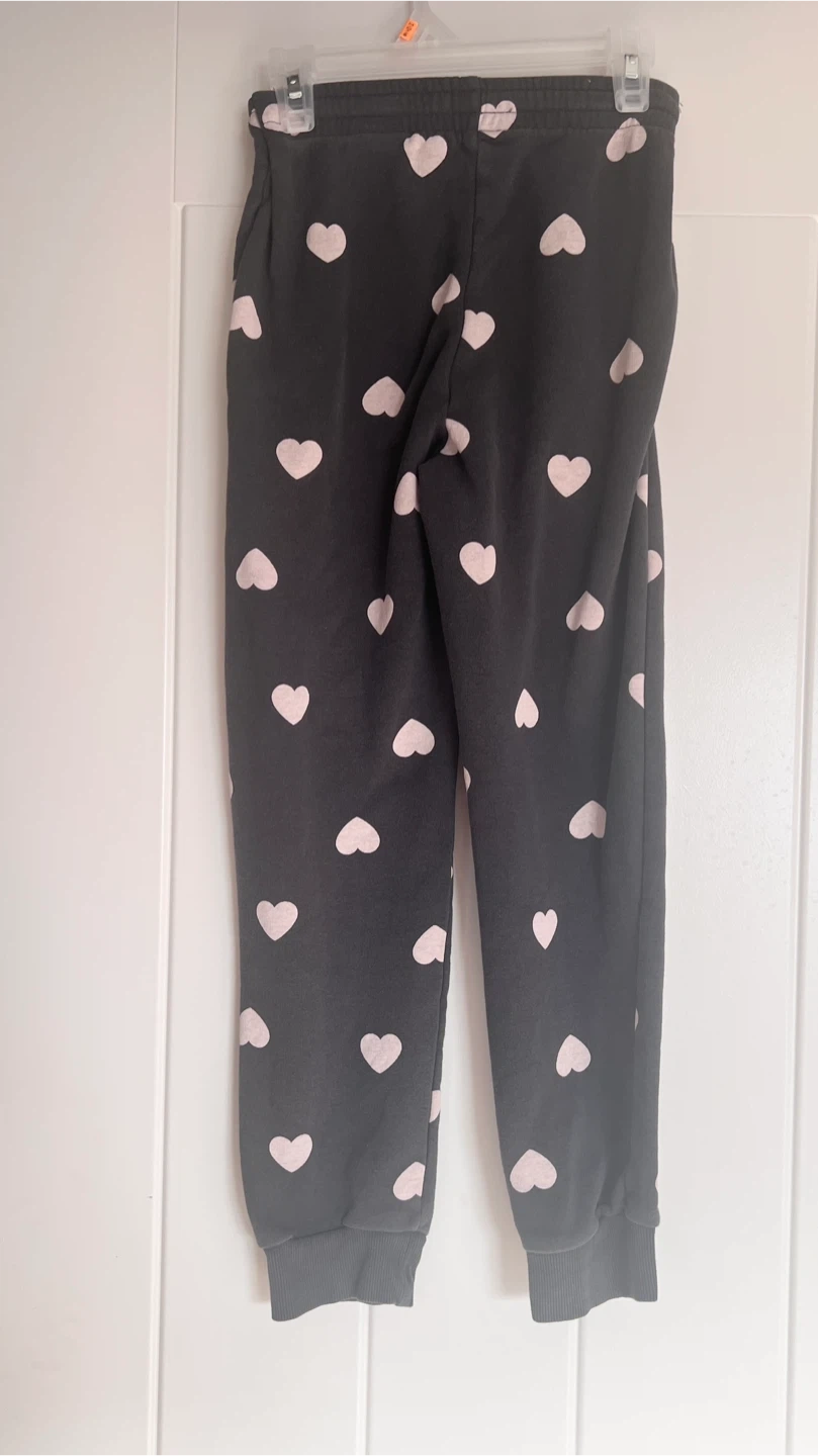 Selling these cozy black sweatpants with a cute heart pattern! They're in great condition and perfect for lounging around the house or running errands. The material is soft and comfy, making them ideal for everyday wear. They are a size small and would fit someone comfortably. Feel free to message me with any questions!