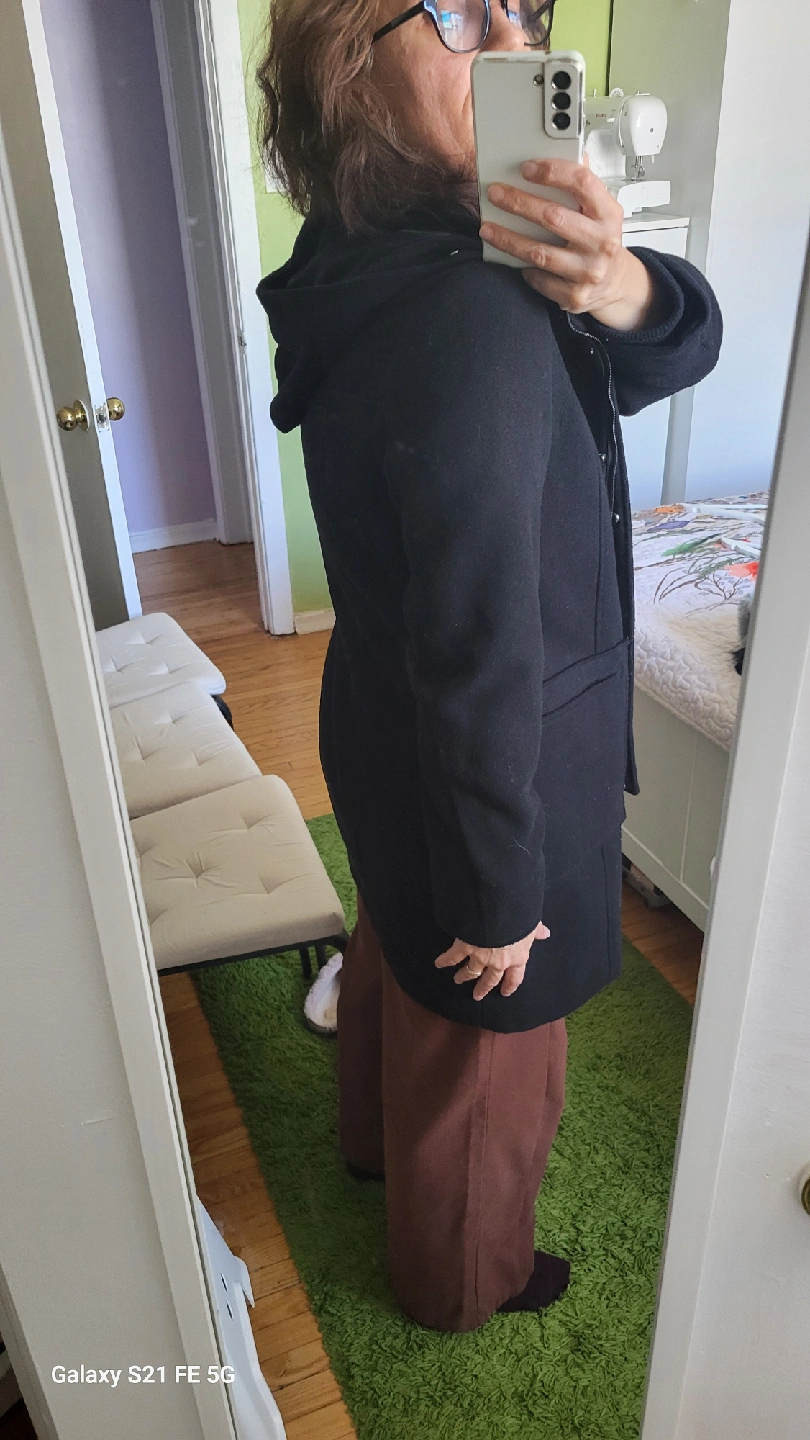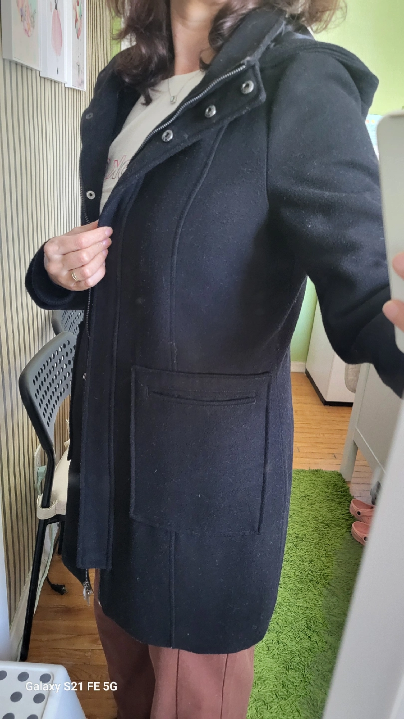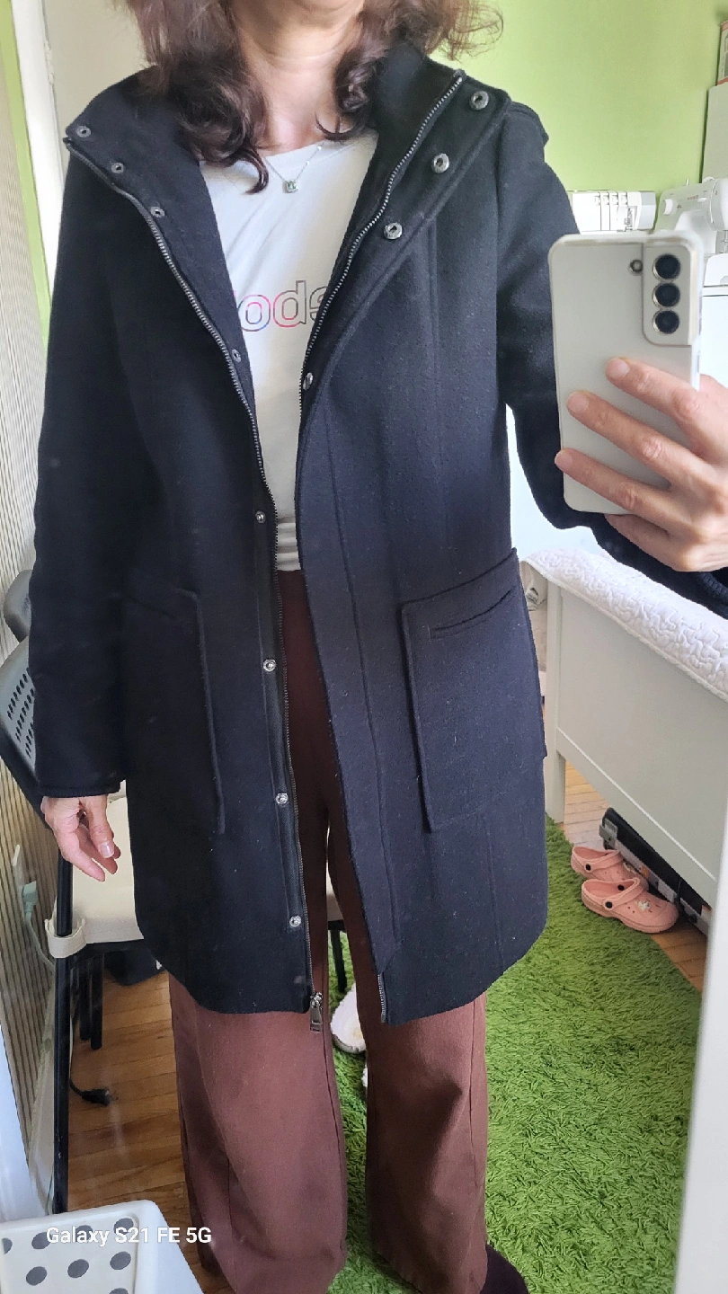 A stylish black hooded coat, perfect for cooler weather! It features a classic design with functional pockets and a comfortable fit. This coat is in great condition and ready for a new home❤️