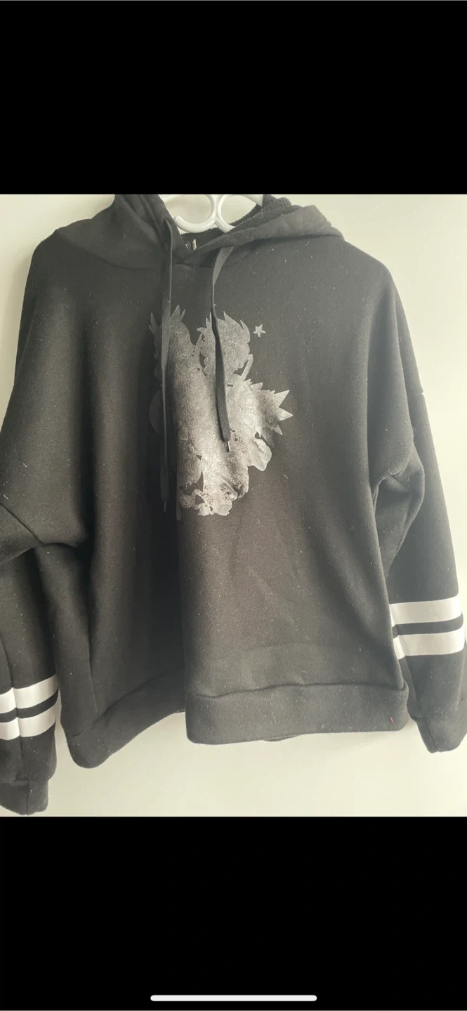 Selling a black hoodie with white stripes on the sleeves! It's in great condition
