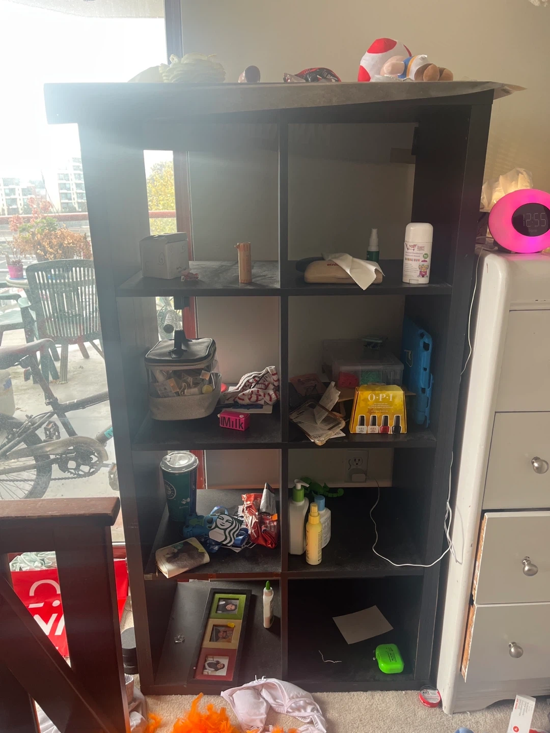Black IKEA shelving unit with multiple compartments, perfect for organizing books, decor, or other household items. It's in good condition and ready for a new home! Contents on shelves not included:)