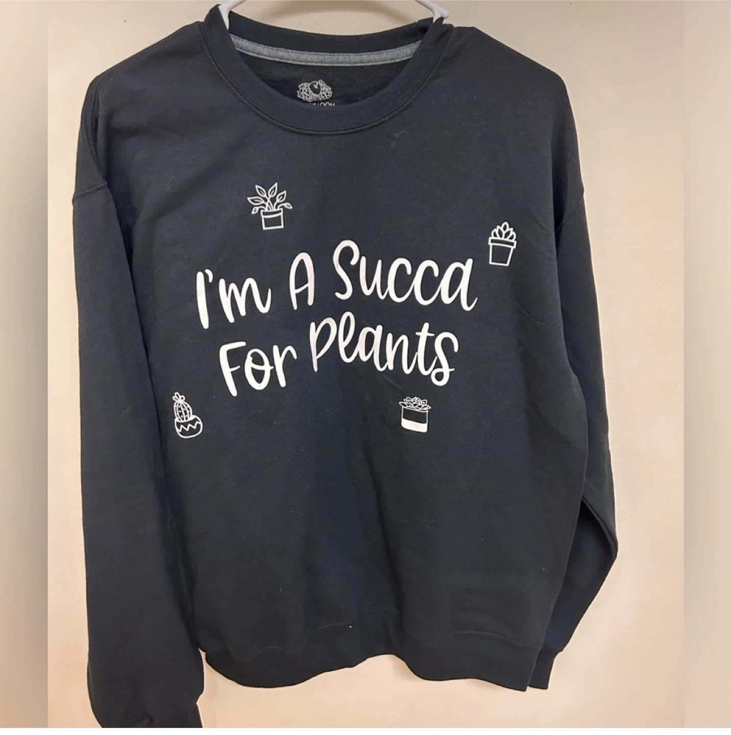 Graphic by makers gonna make on a fruit of the loom sweater. Succa for plants graphic. Black sweater. Size medium. Brand new $40 Pickup between kincardine & ripley or I can arrange delivery in port Elgin-Owen sound, walkerton-Durham, wingham-listowel-kw/cambridge, goderich-bayfield, Woodstock & Arthur-Orangeville-Newmarket-Lindsay-Peterborough AREAS.