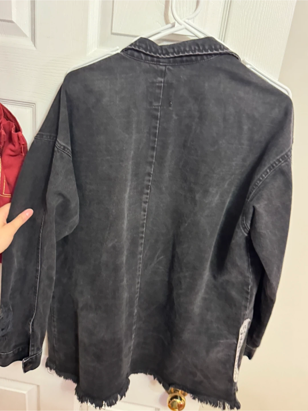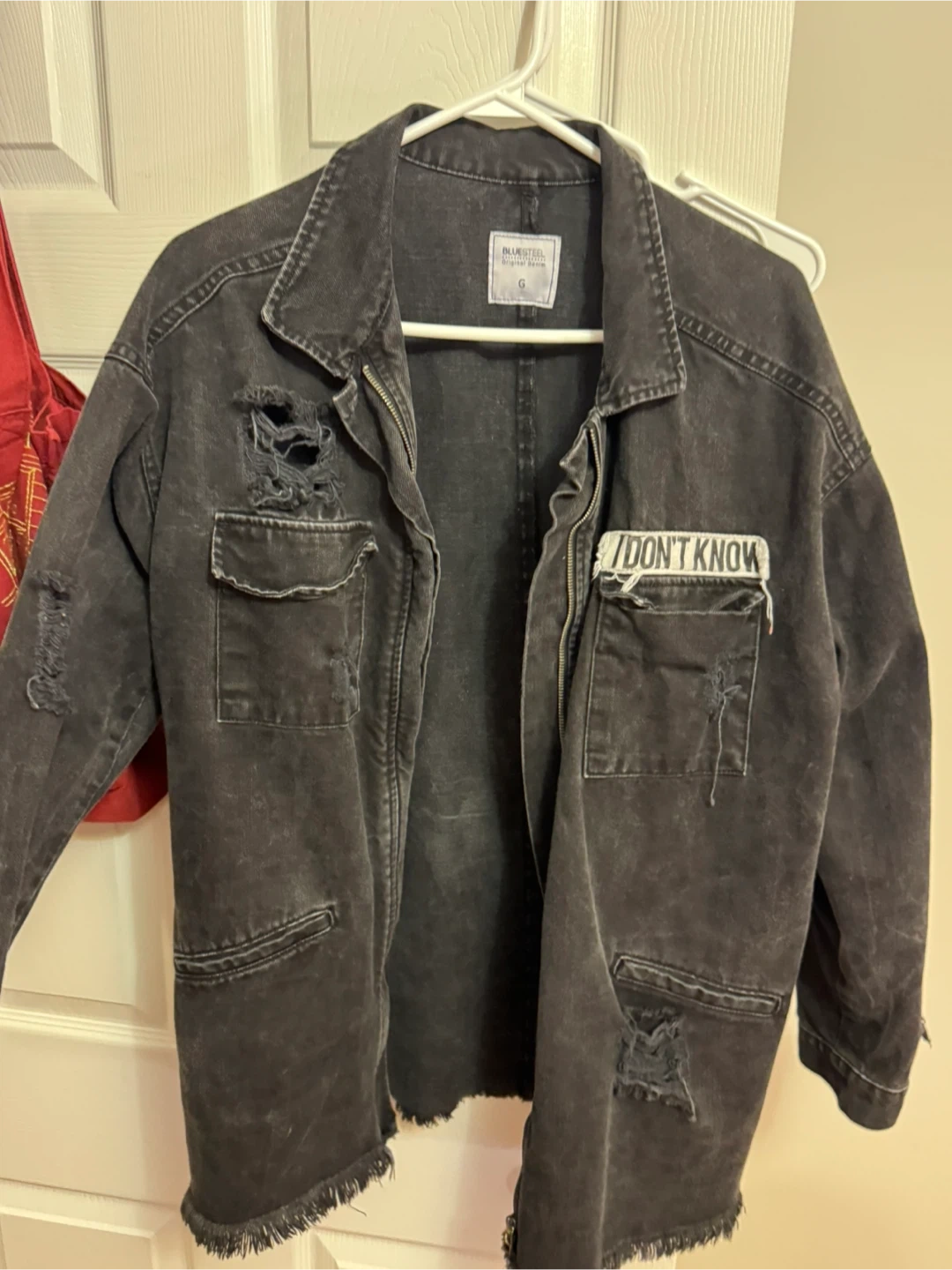 Selling a distressed black jacket from Bluesteel in size large. It has a unique, edgy look with intentional rips and a frayed hem. Perfect for adding some character to your wardrobe!