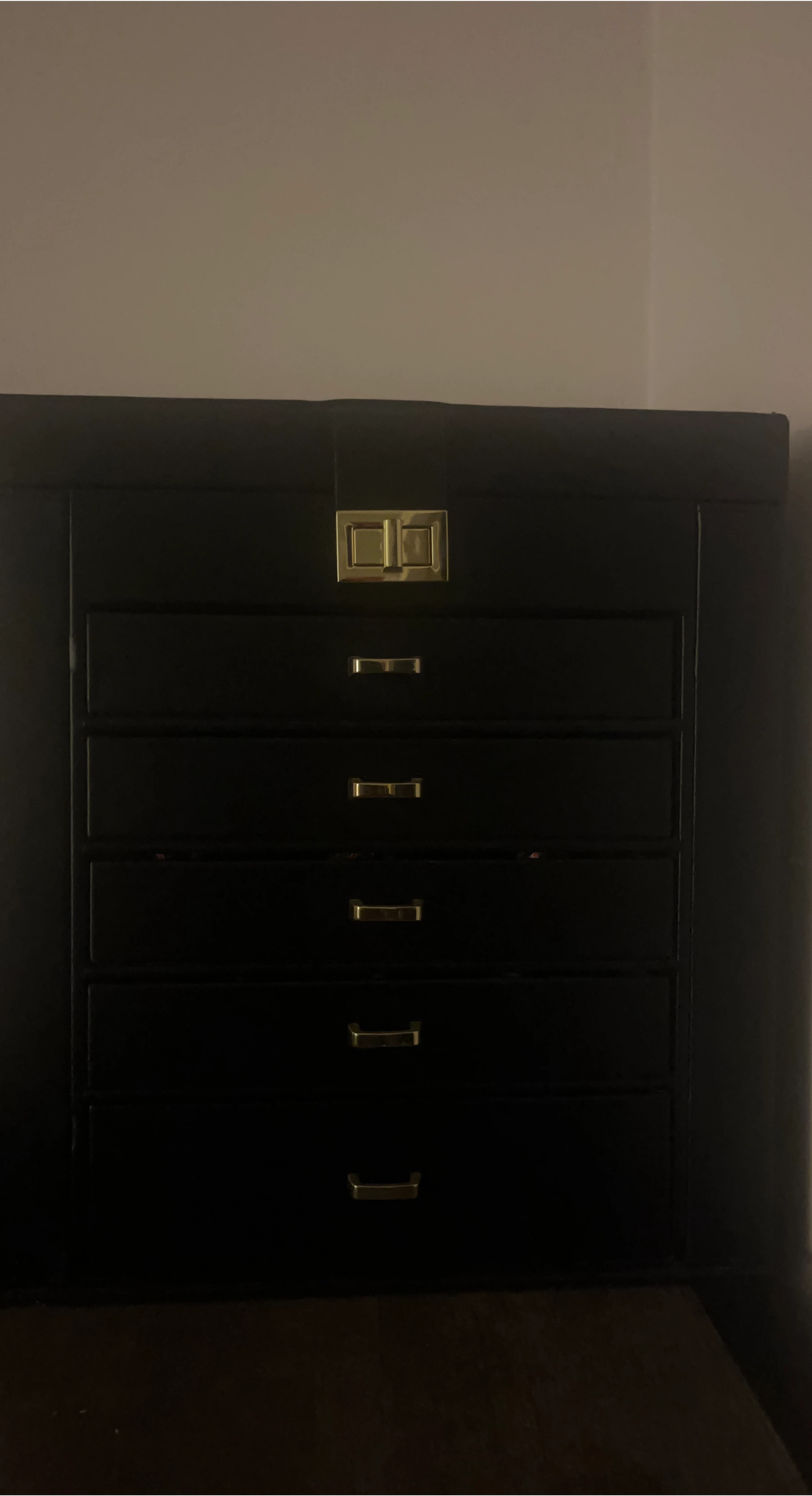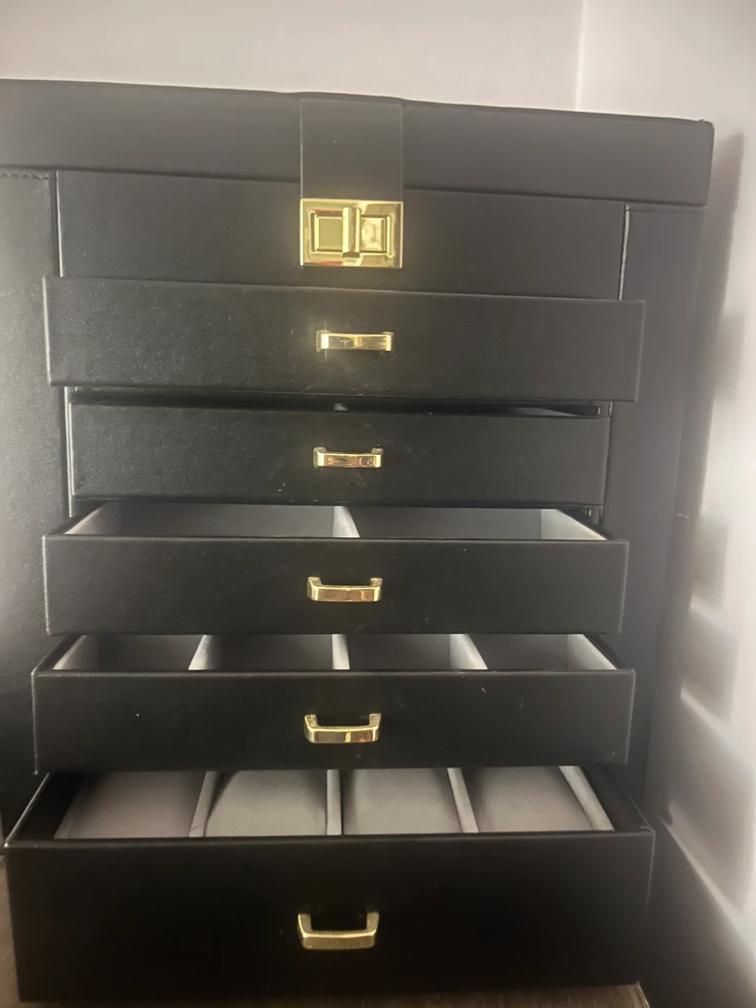 Selling a black jewelry box! It features multiple drawers and compartments for organizing your precious items. Perfect for keeping your jewelry safe and tidy!