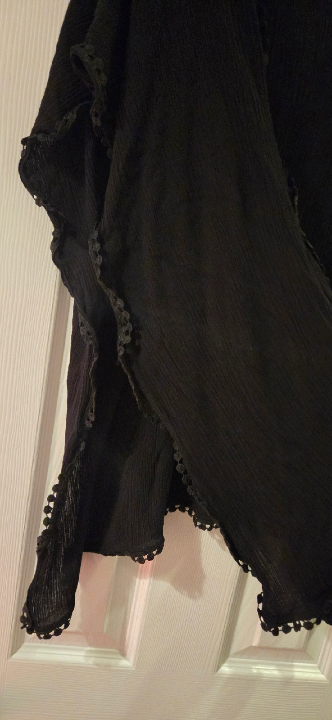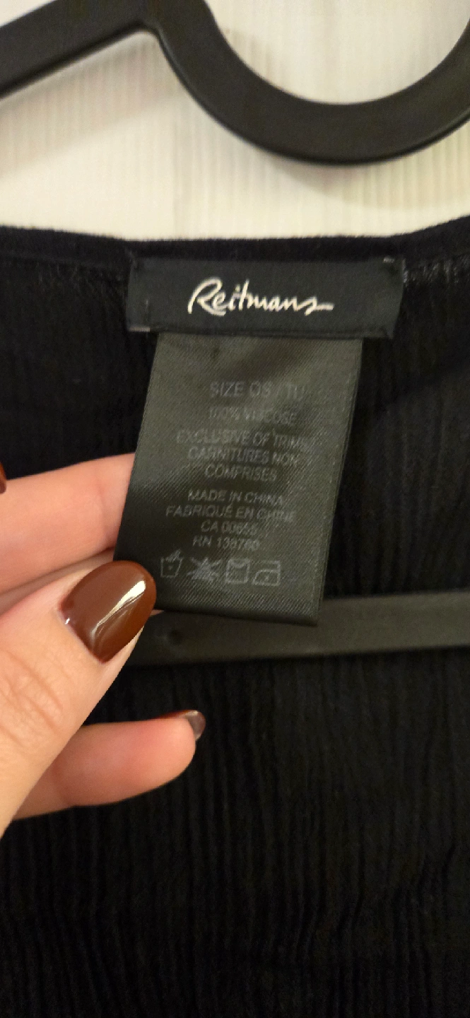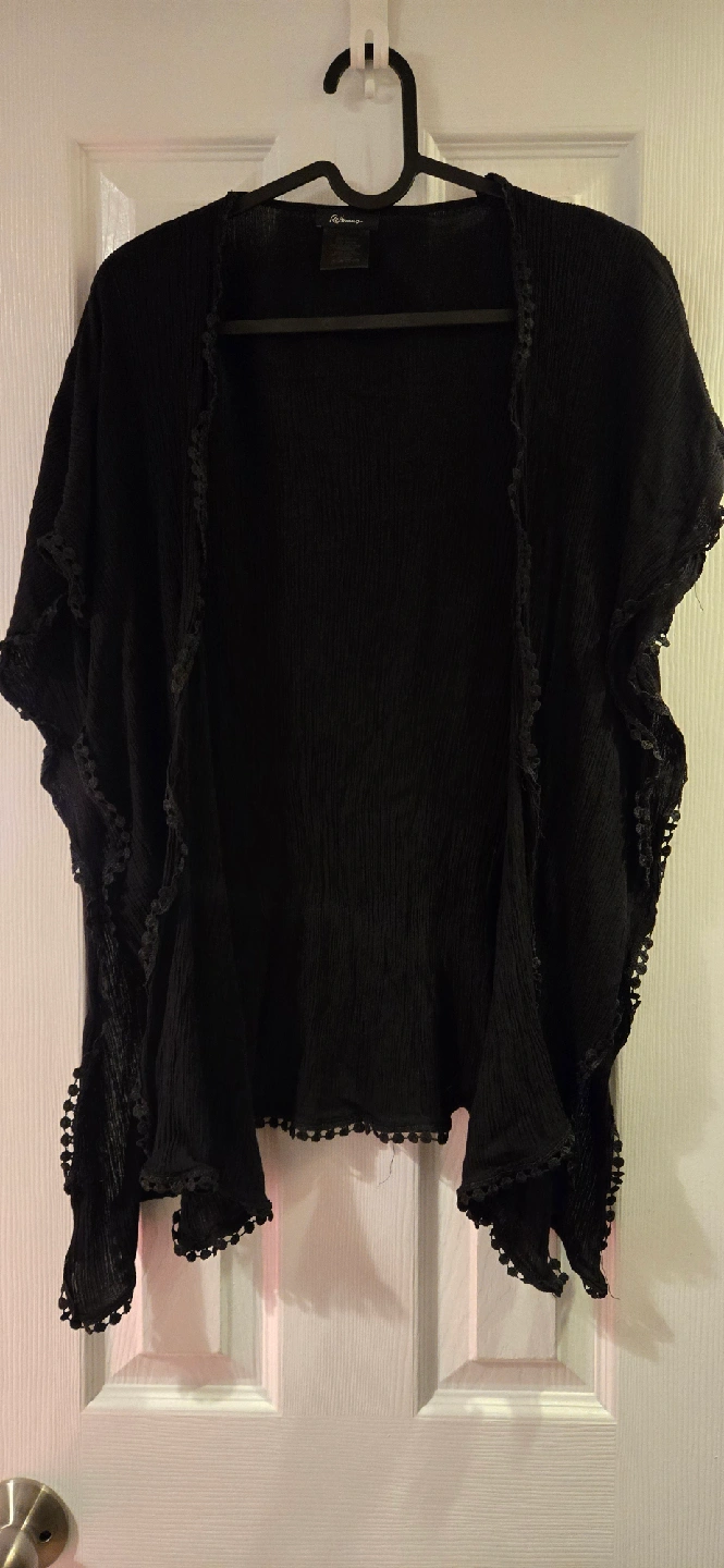 cute black kimono from Reitmans! It's a one-size-fits-all and made of 100% viscose. Perfect for layering or wearing as a light cover-up. It's in great condition and barely worn.