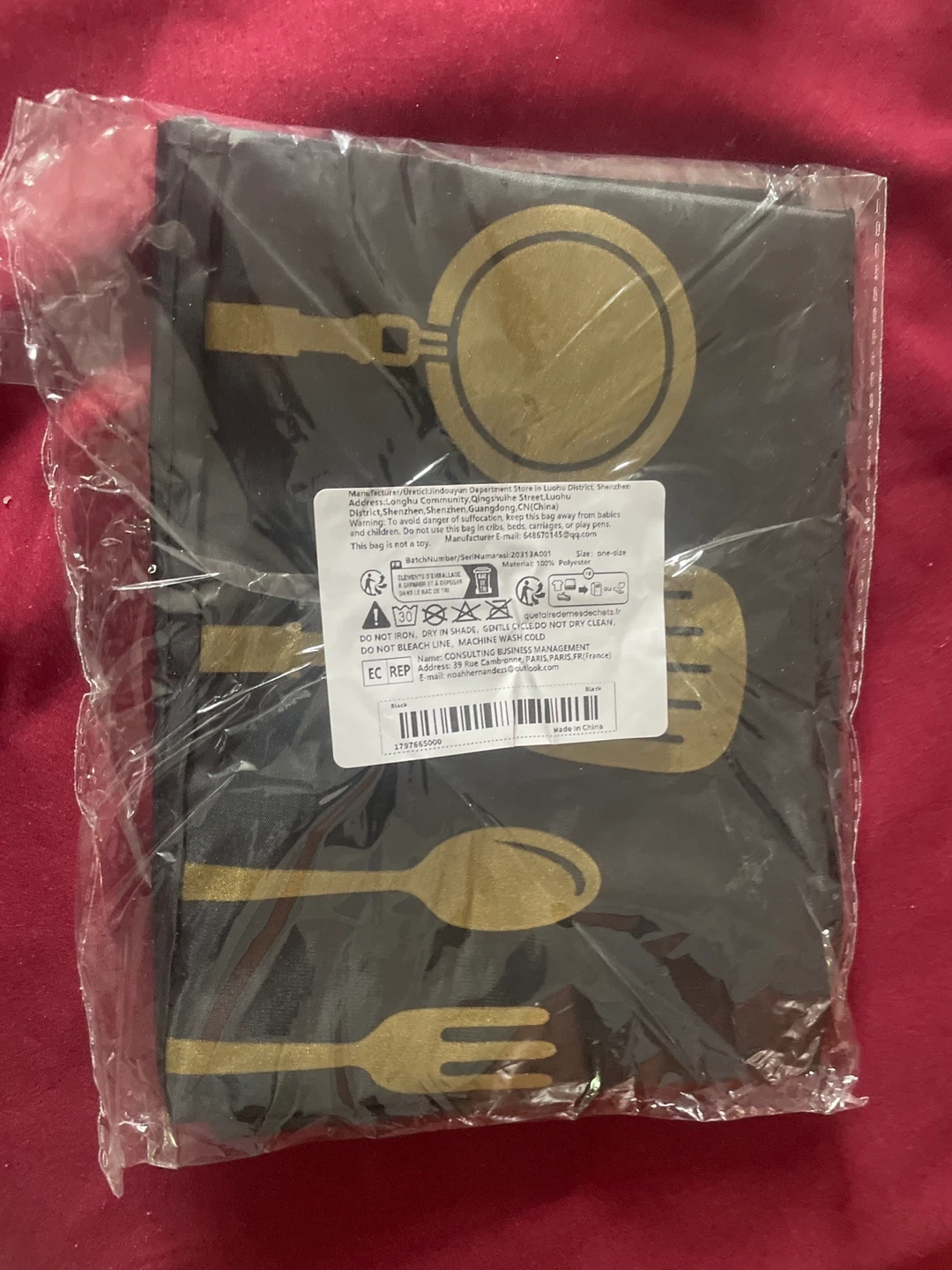 Brand new black tote bag with a gold kitchen utensil print (frying pan, spoon, fork). One size. Made of 100% polyester