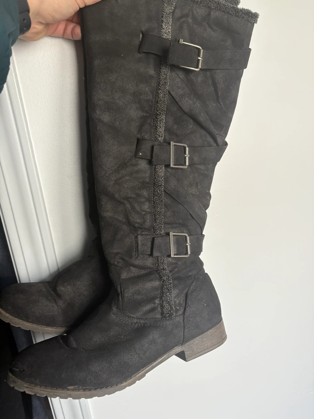 Selling a pair of black knee-high boots. They feature buckle detailing and a cozy lining at the top. Perfect for adding a bit of edge to your outfit!