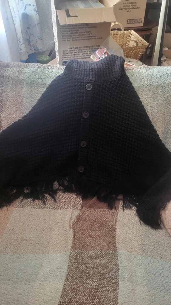Here's a cozy black knit poncho! It features a high neckline, button-up front, and fringe detailing along the bottom. Perfect for layering on cooler days!