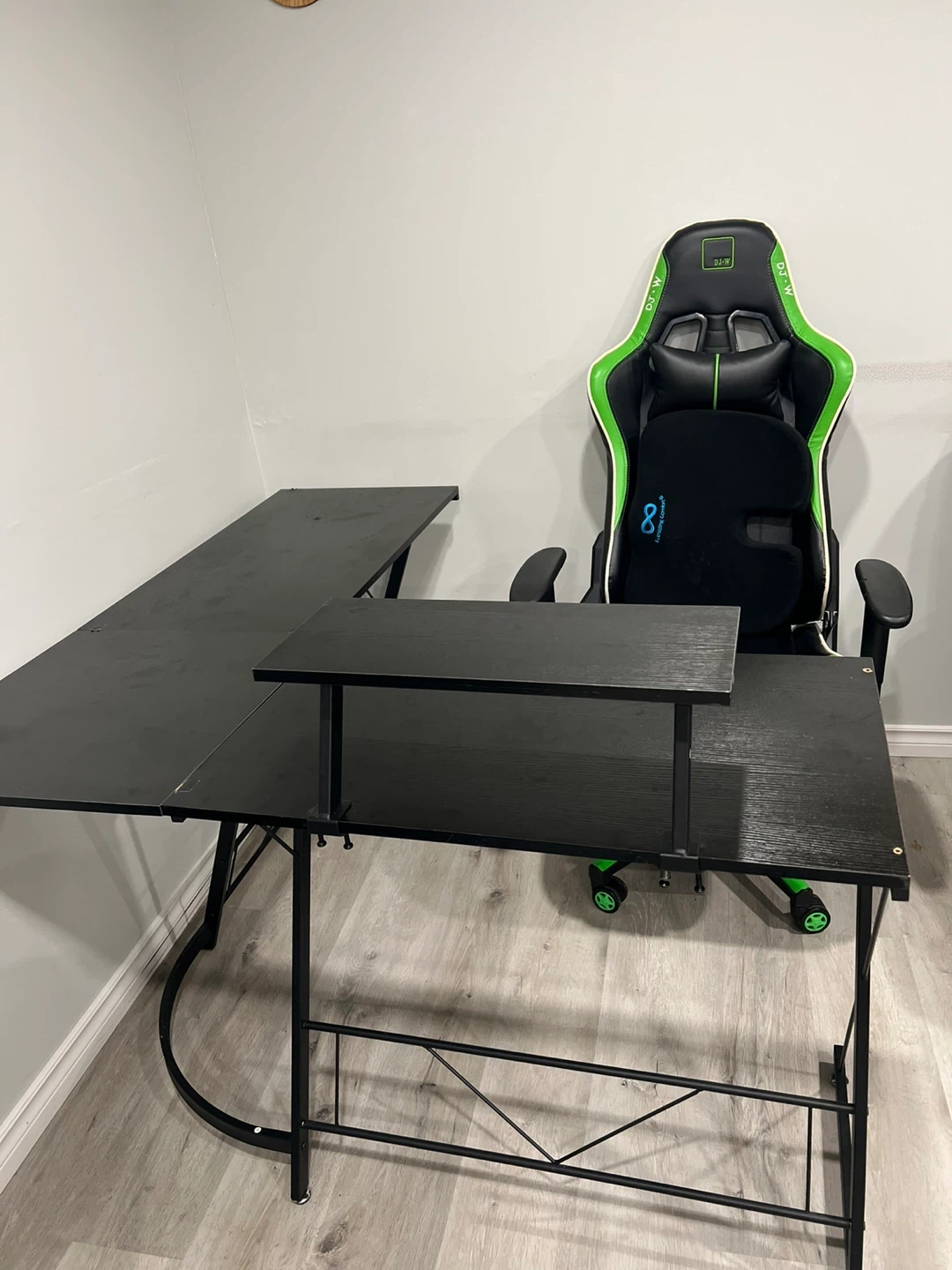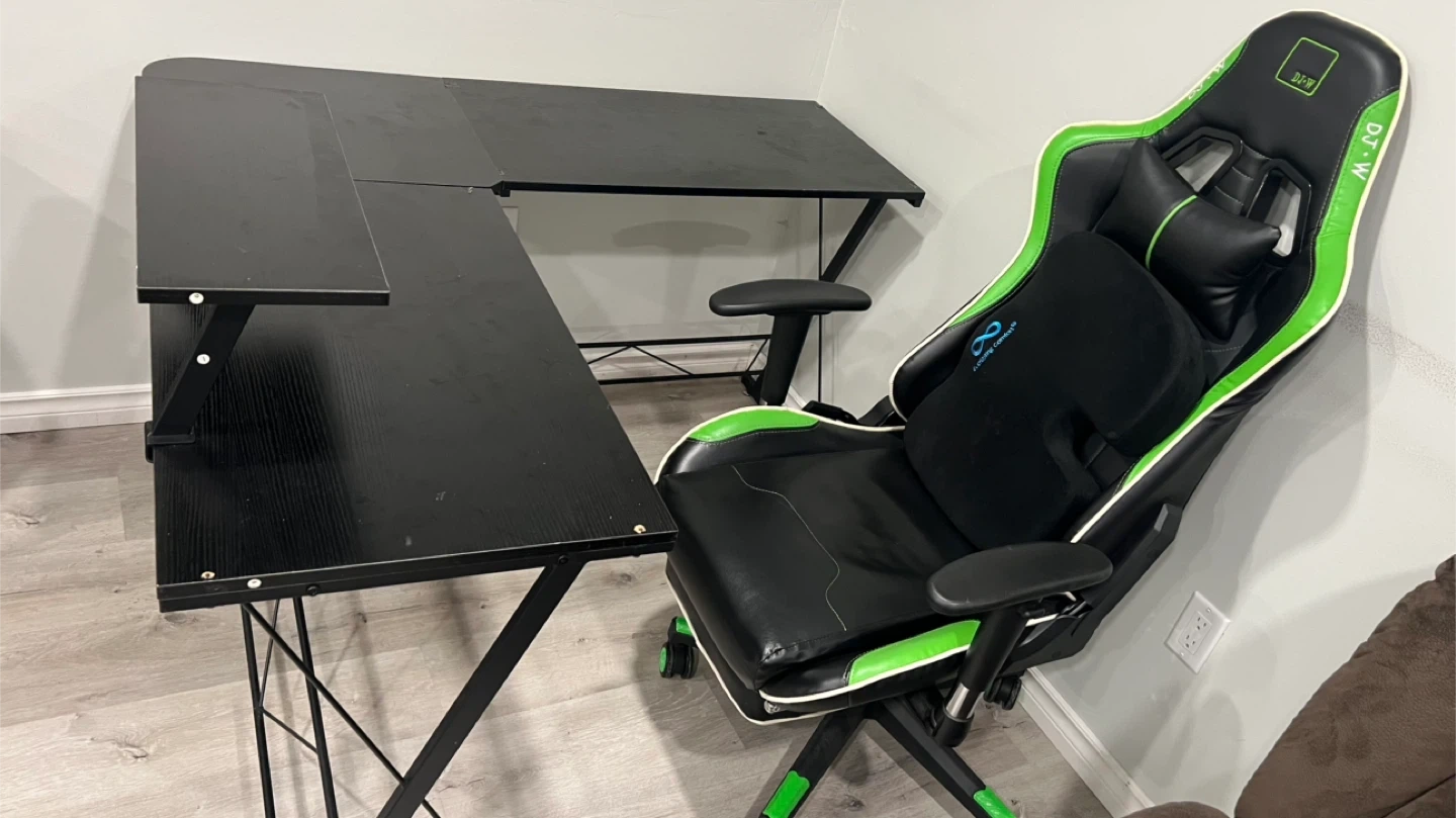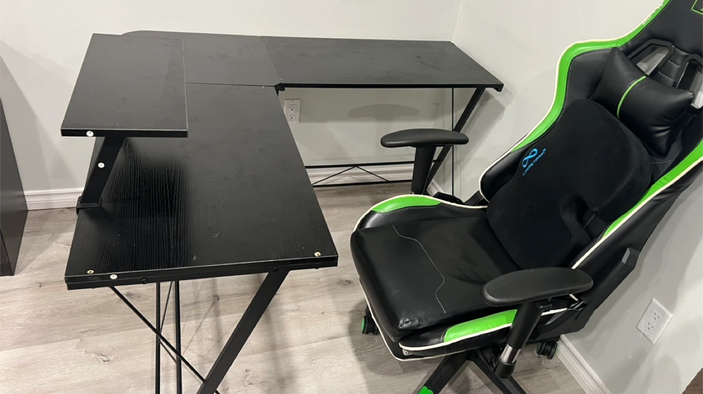 Selling a black L-shaped gaming desk and a green and black gaming chair. Both are in good condition and ready for a new home! Perfect for setting up your gaming station or home office