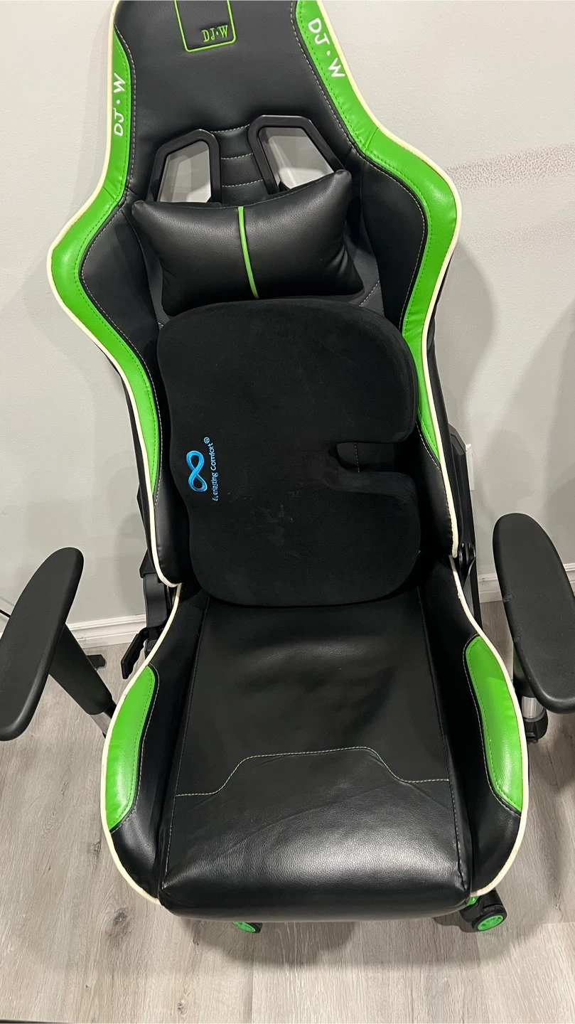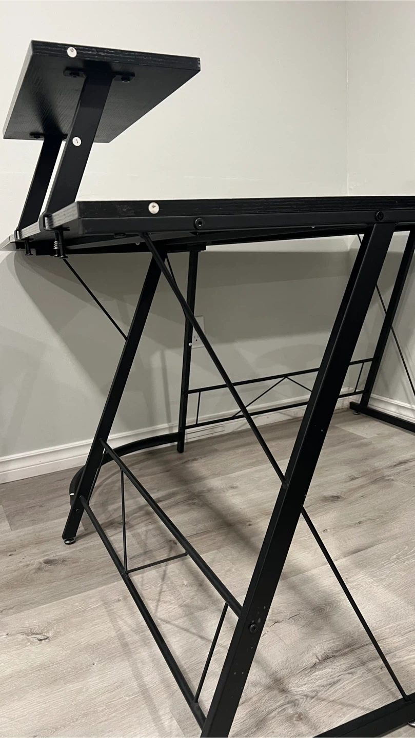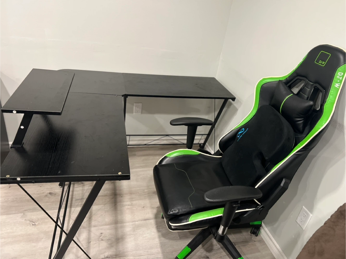 Selling a black L-shaped gaming desk and a green and black gaming chair. Both are in good condition and ready for a new home! Perfect for setting up your gaming station or home office
