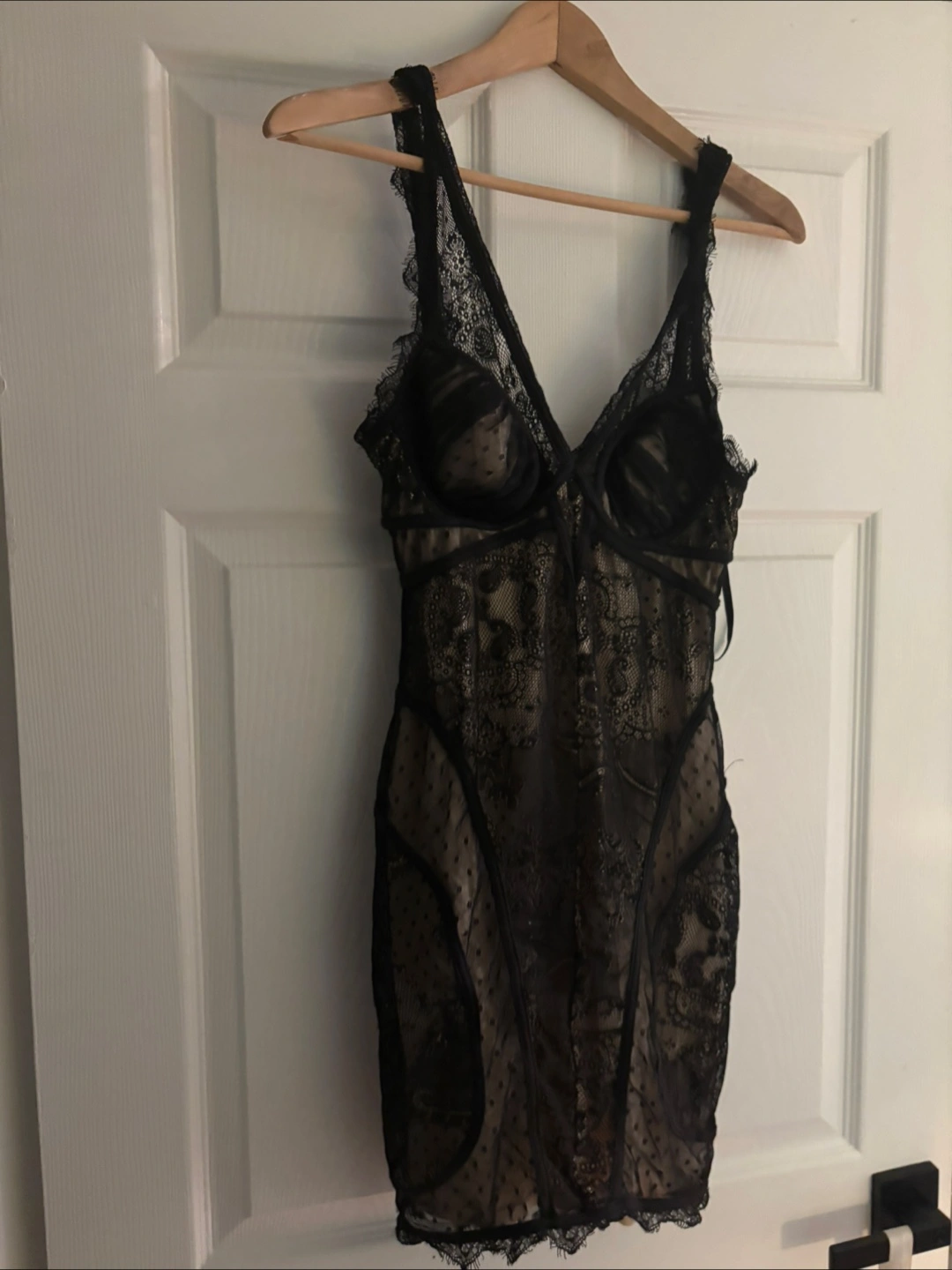 Selling a black lace lingerie dress. It has a V-neck and a delicate lace pattern throughout. Perfect for a special occasion or just feeling a little fancy!