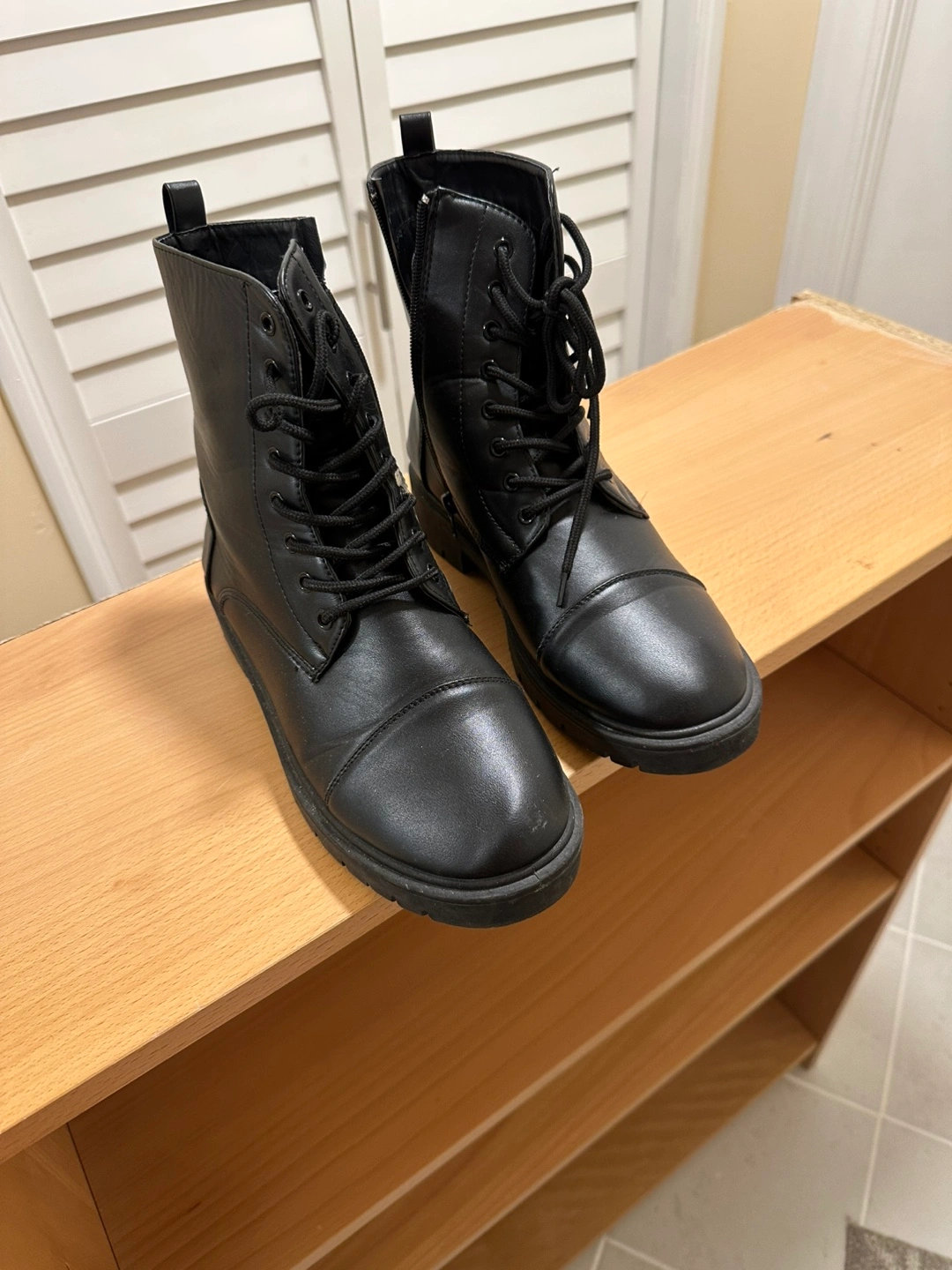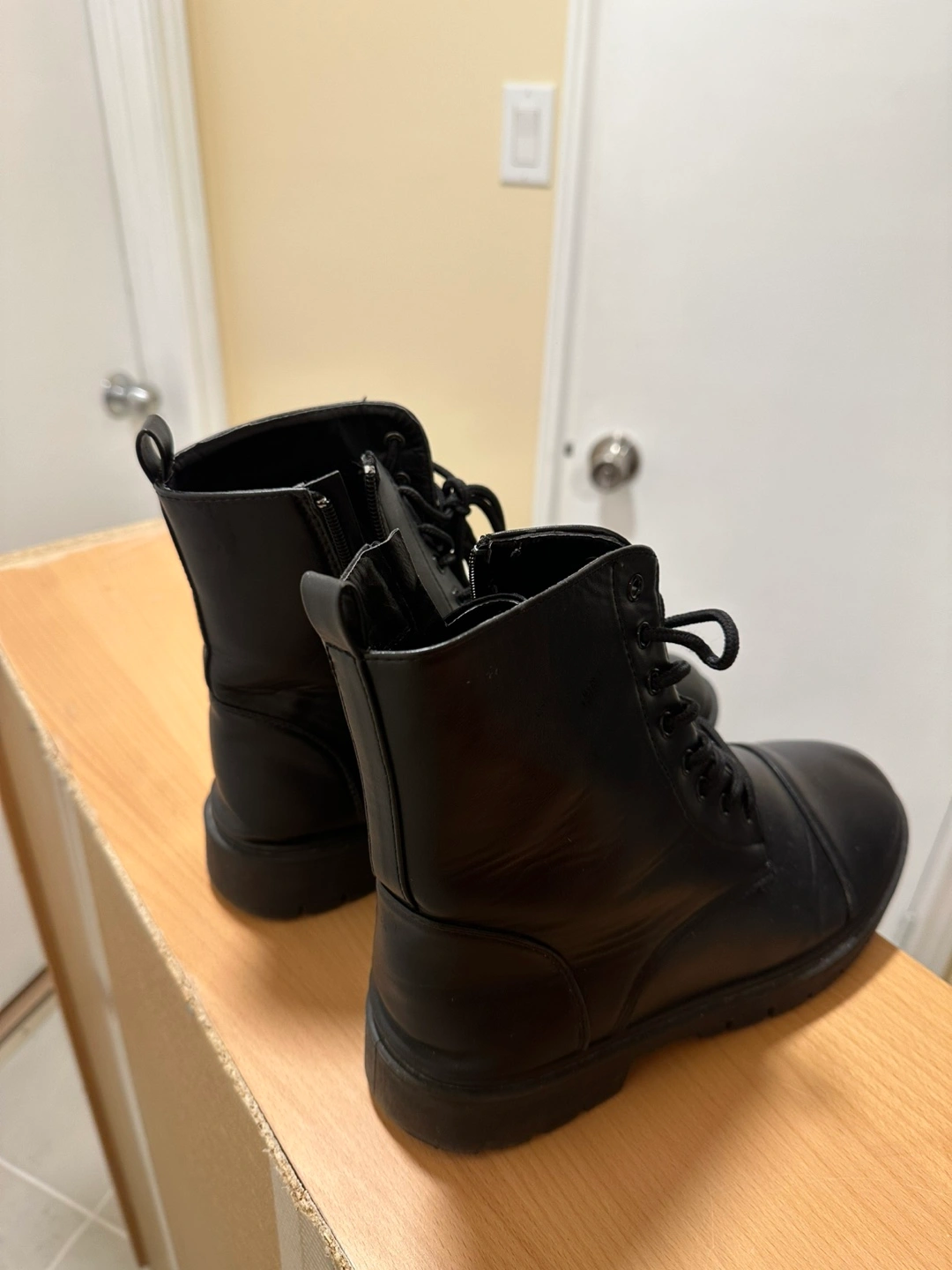 Black leather boots with laces and a side zipper. Great for casual wear or dressing up.
