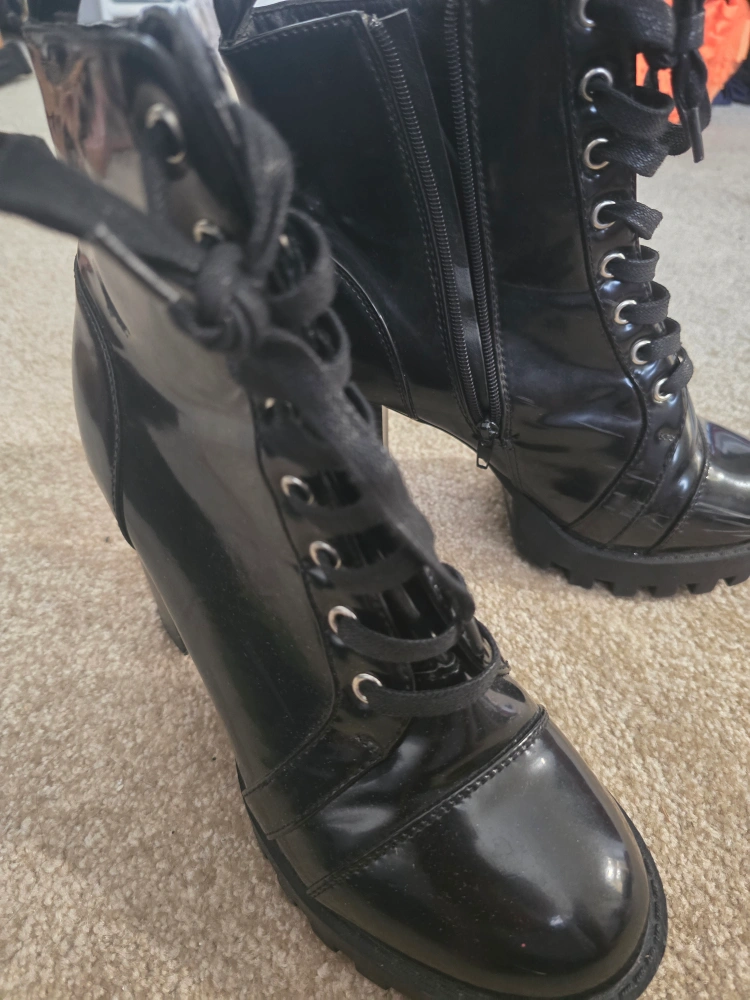 These are a pair of black, lace-up ankle boots with a heel. They have a glossy finish and a side zipper for easy wear. Perfect for adding a bit of edge to any outfit!