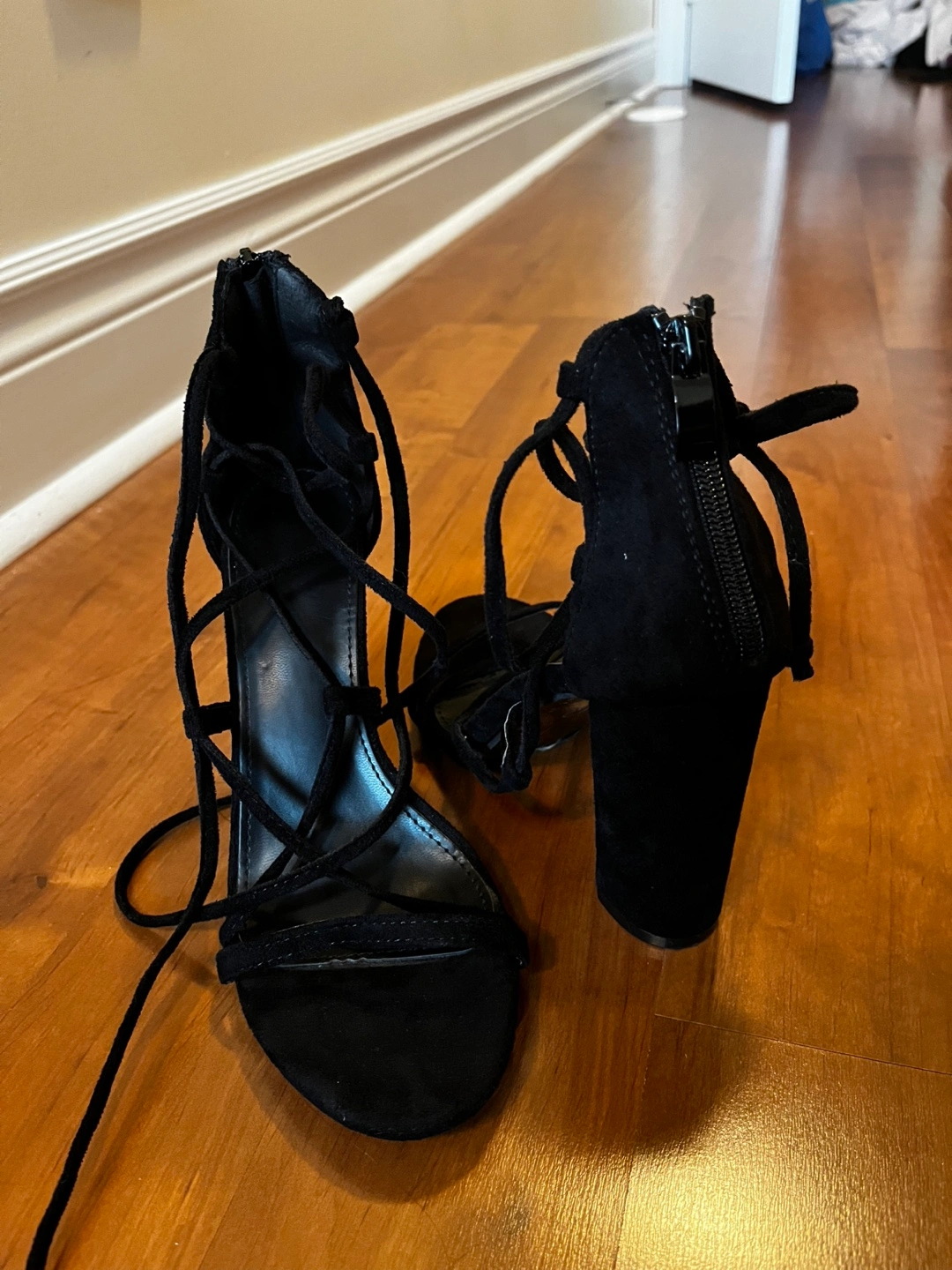 Pair of black suede high heels. Lace-up design. Block heel. Zip closure on the back. Size 37