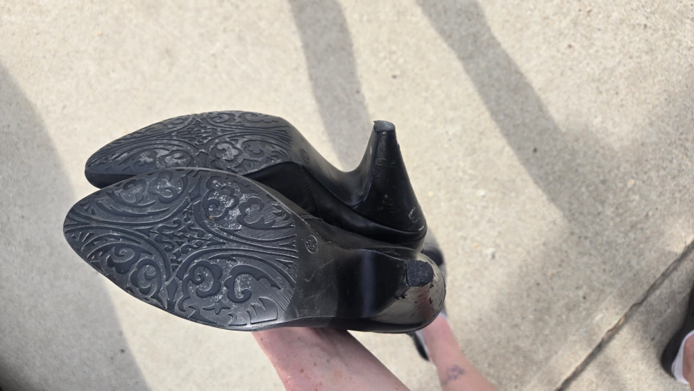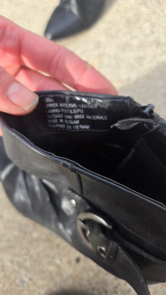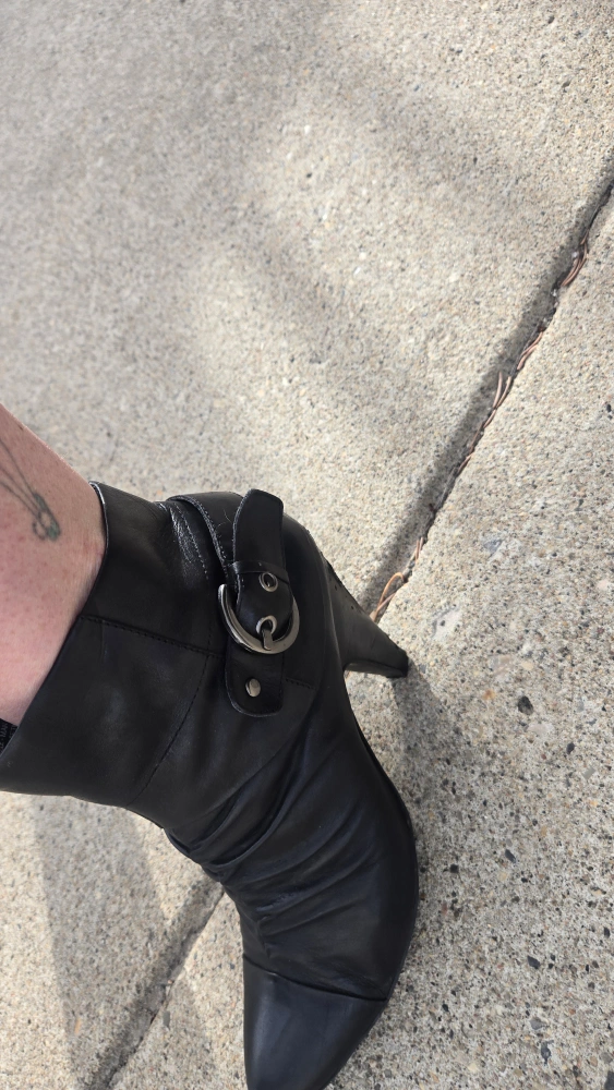 Selling a pair of black leather ankle boots in women's size 8 (38M). These stylish boots feature a unique heel and a decorative buckle. The upper material is genuine leather, with a lining of textile/PU. The outer sole is made of man-made materials. They're perfect for adding a bit of edge to any outfit!