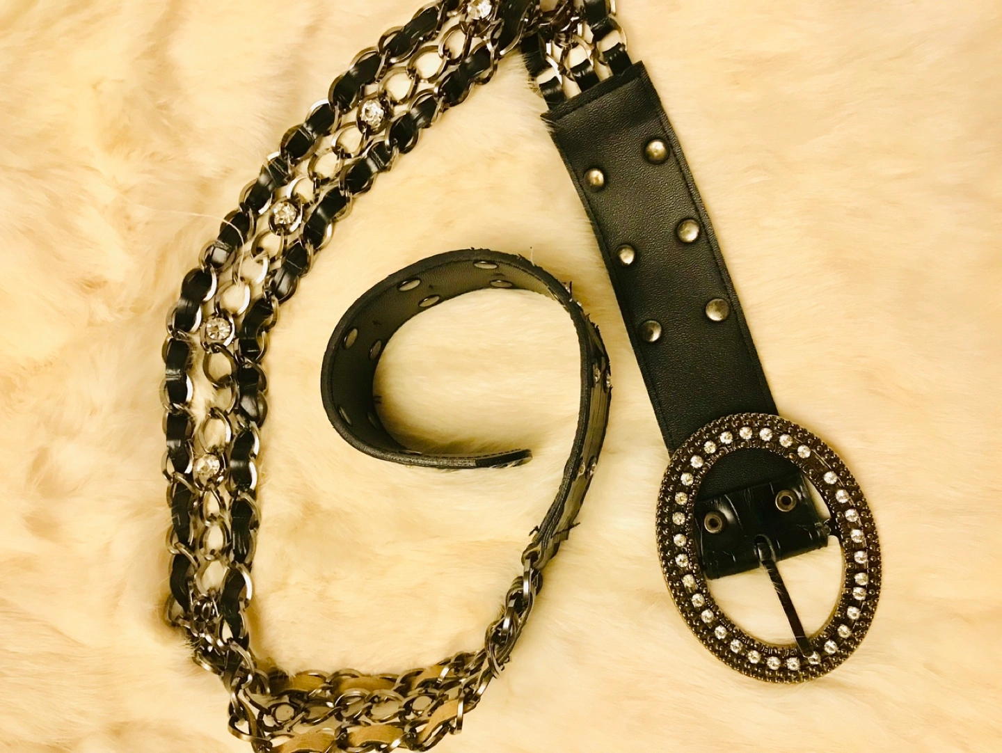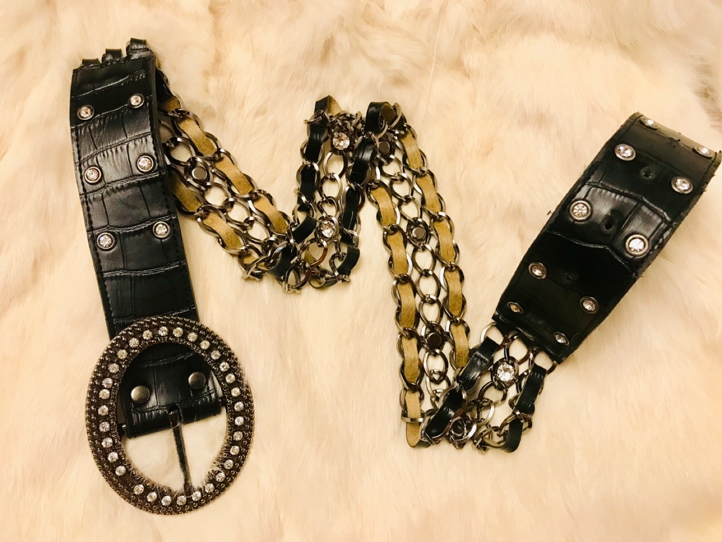 Stylish black leather belt. Features a ornate rhinestone buckle and a long chain detail. Crocodile-embossed leather. Perfect for adding a touch of glamour to any outfit.