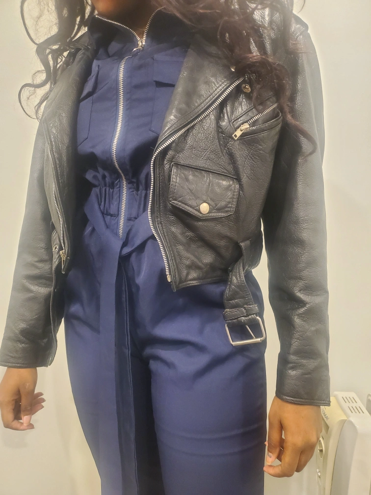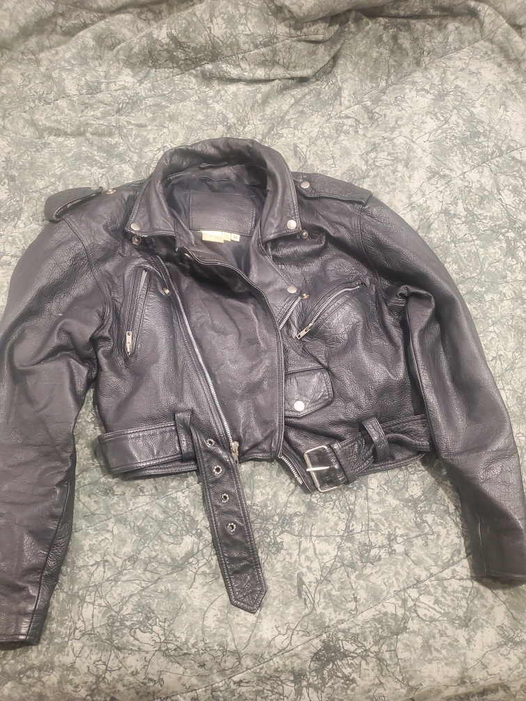 Selling a stylish black leather biker jacket! It's a cropped style and in great condition. The jacket is a size M and features a belted waist and zippered details on the back. Perfect for adding a bit of edge to any outfit