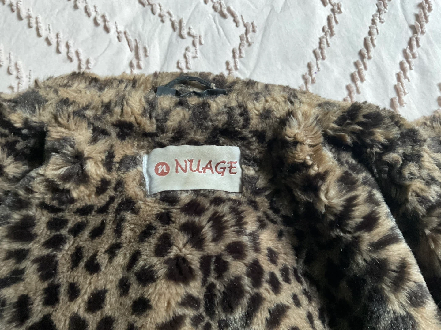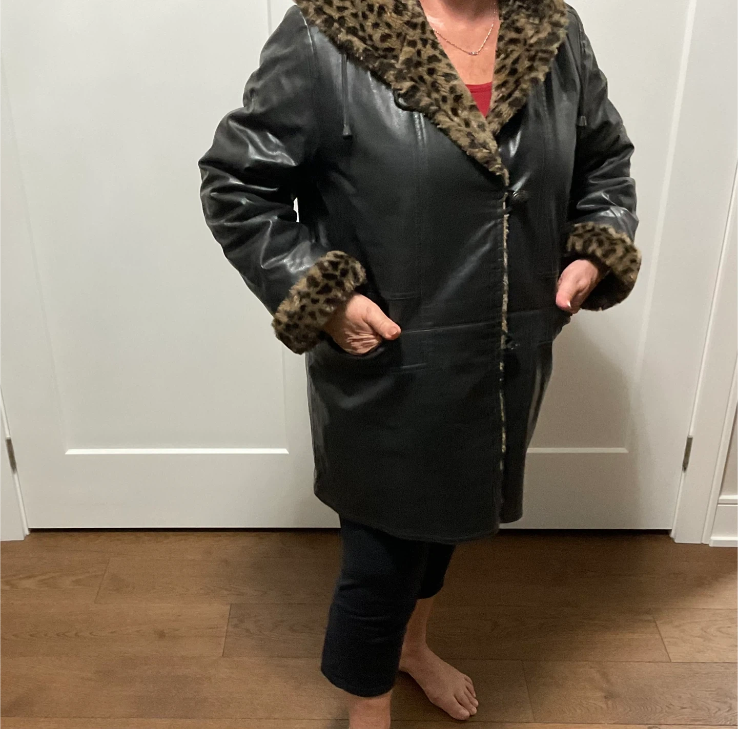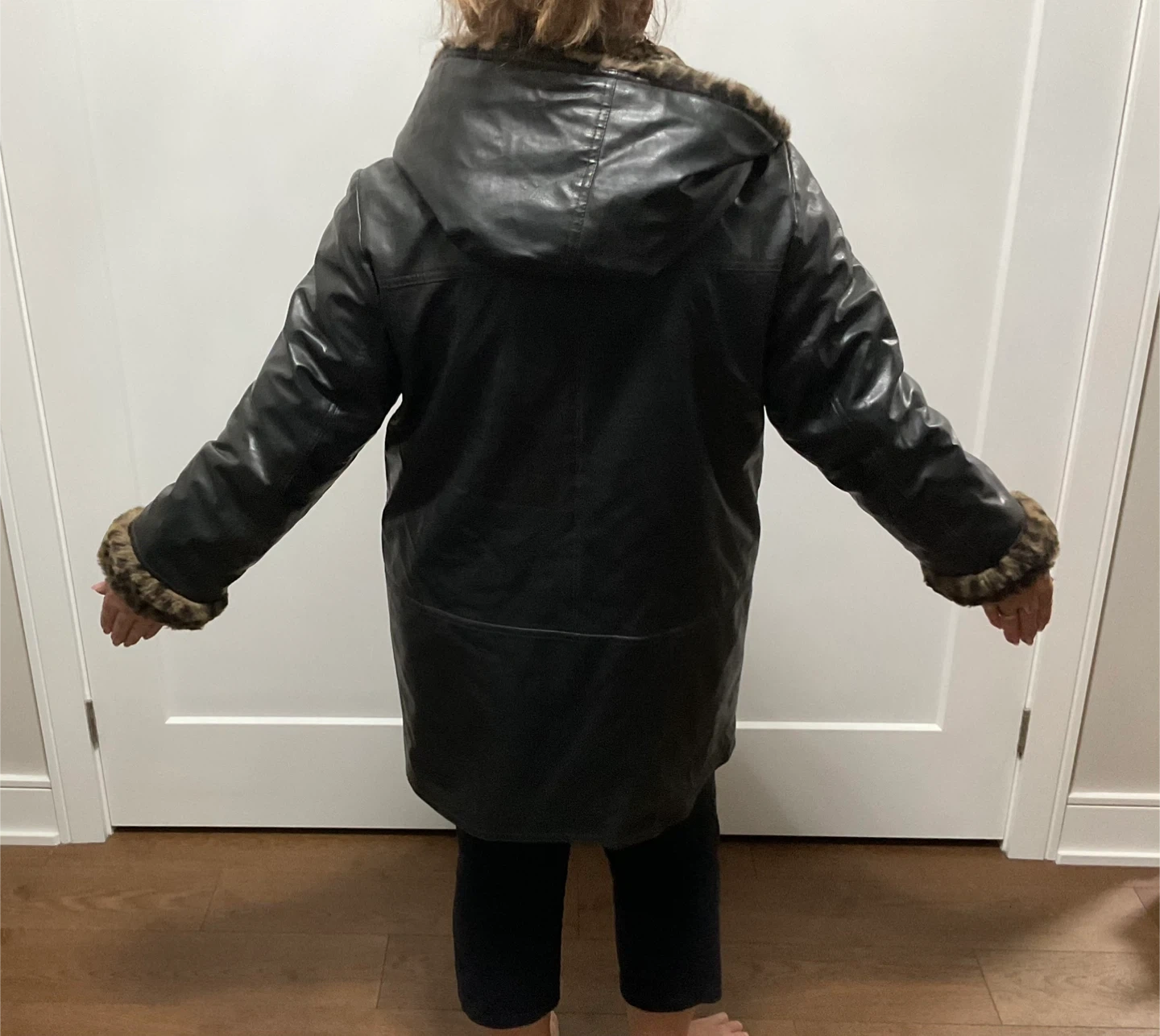 Selling a NUAGE black leather coat with a leopard print trim. It has a hood and is in great condition! It's a stylish and unique piece to keep you warm during the colder months