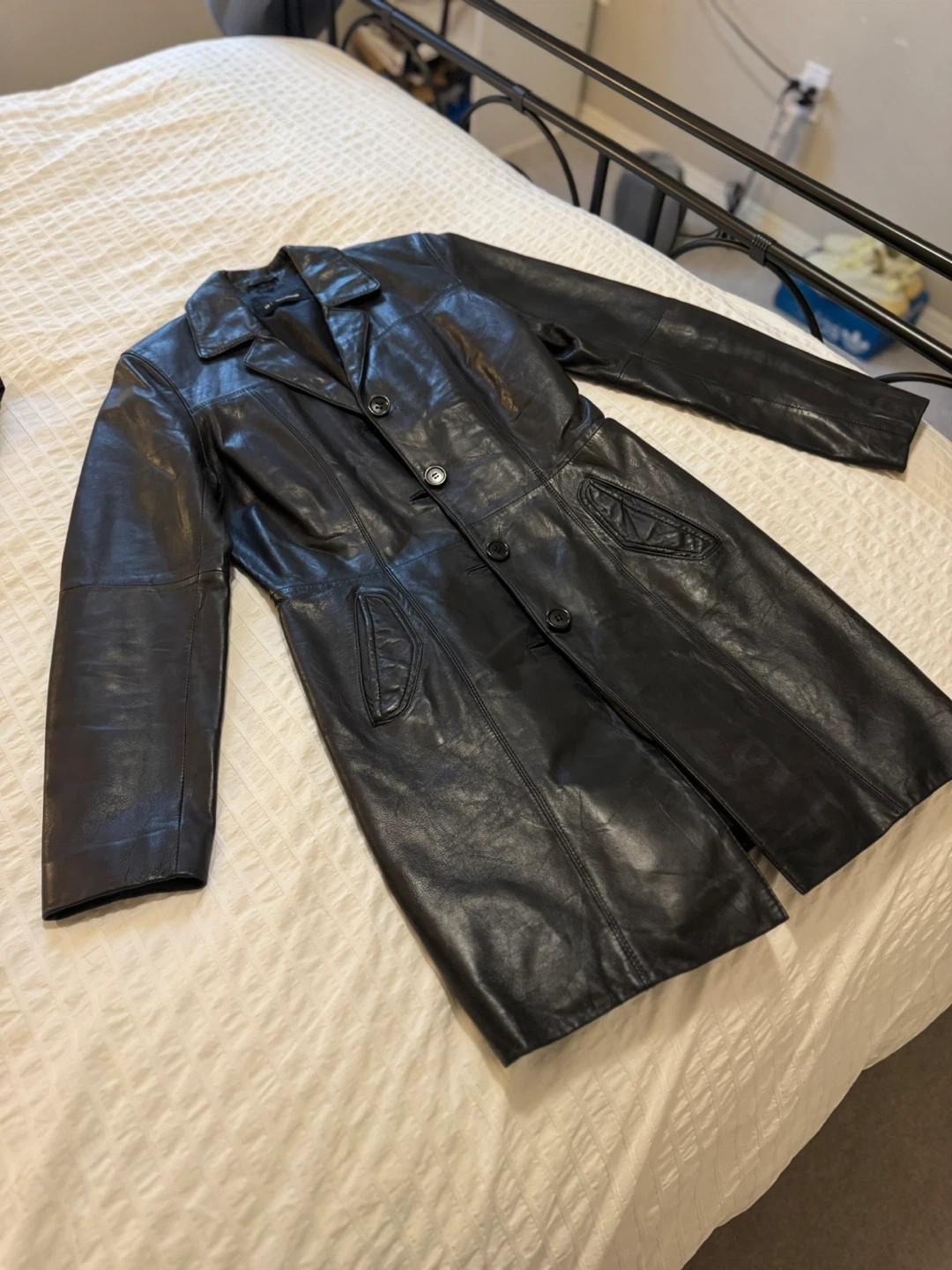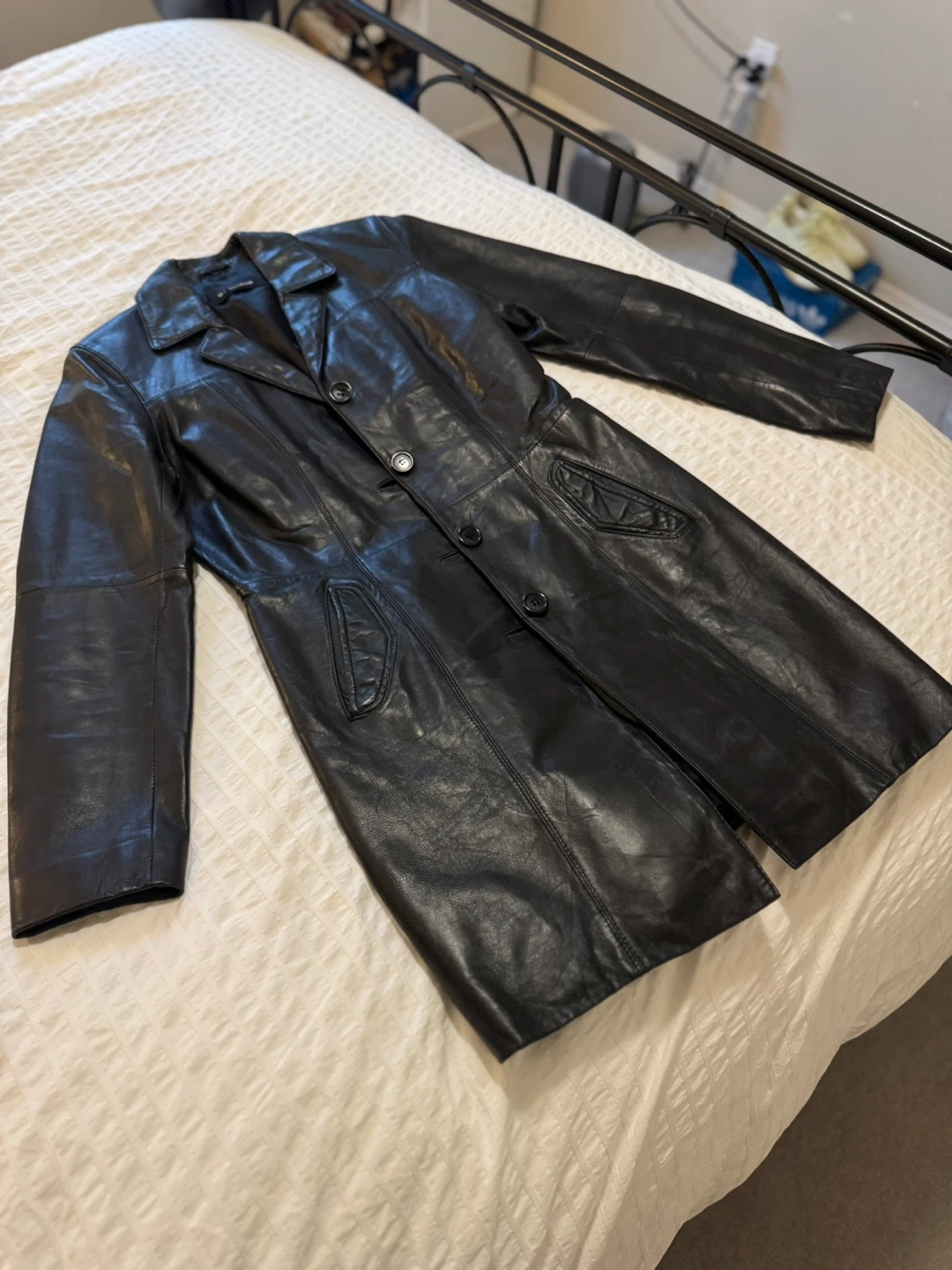 Selling a stylish black real leather coat. It's in great condition and ready for a new home! The material is leather and it's a classic piece for any wardrobe