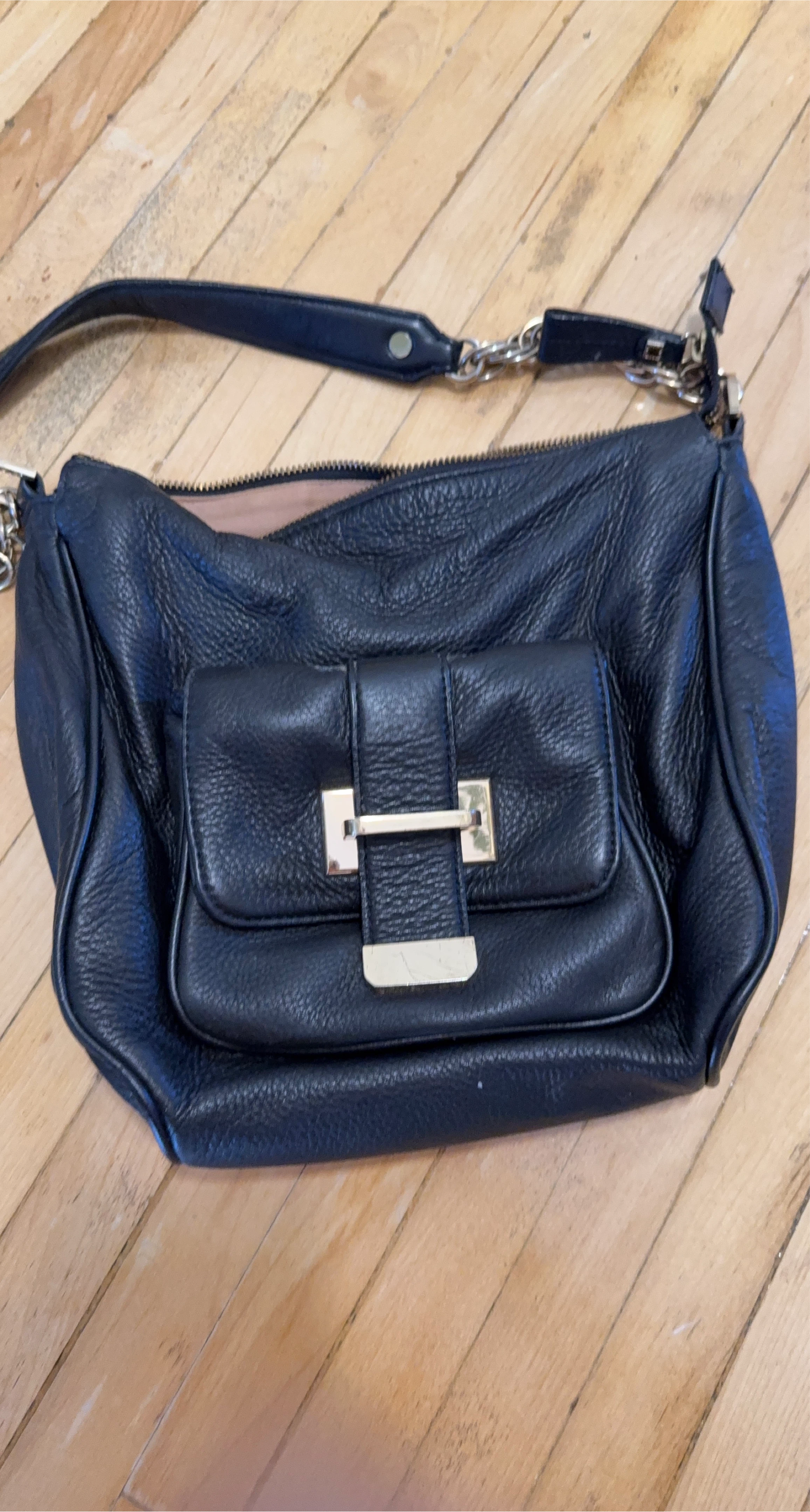 A gently used black leather handbag with a stylish gold-tone buckle detail. It's a classic piece that's perfect for everyday use or a night out. The leather is soft and supple, and the bag is in great condition with minimal signs of wear