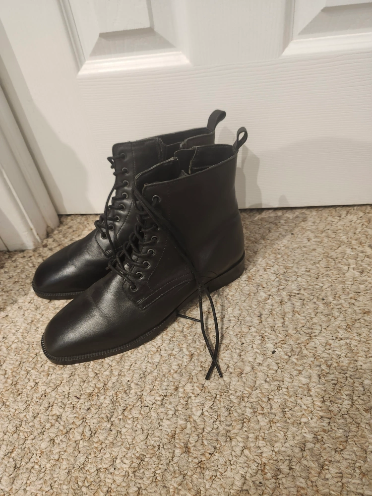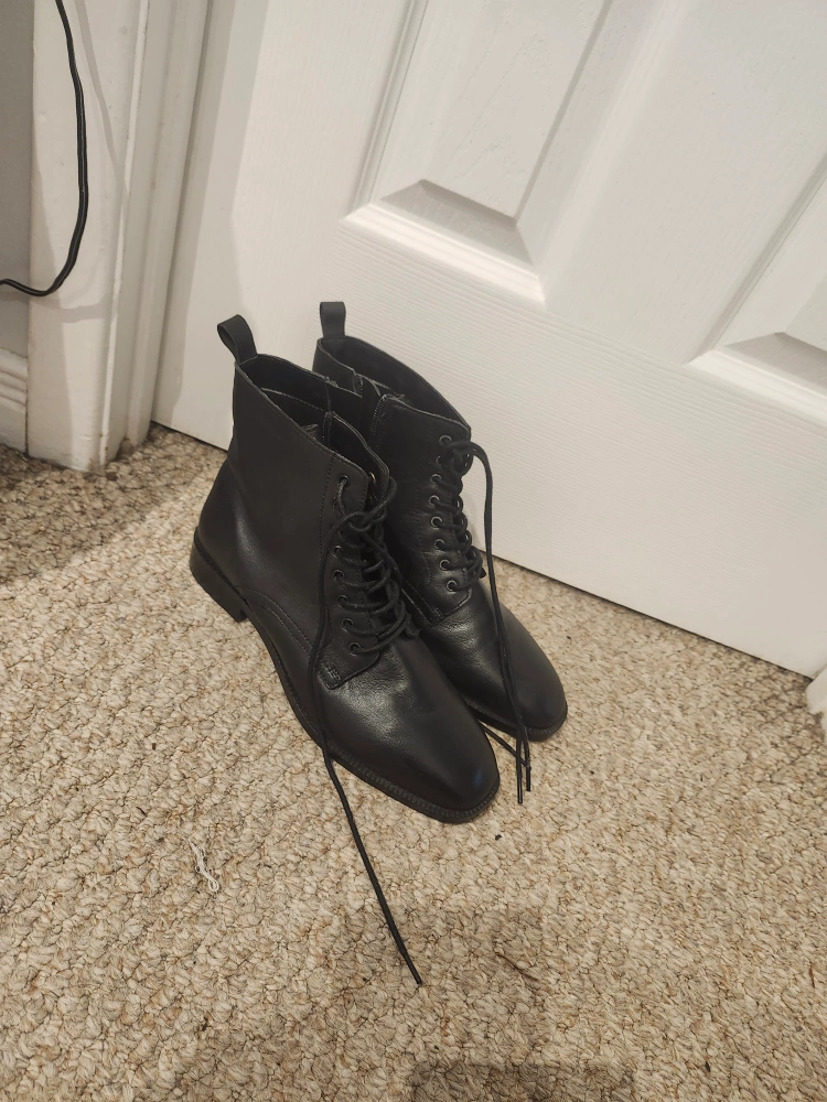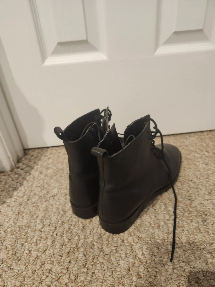 Selling a pair of classic black leather ankle boots. They're in great shape and ready for a new home! These boots feature a lace-up design and a sleek, versatile look that can be dressed up or down. Perfect for adding a touch of edge to any outfit