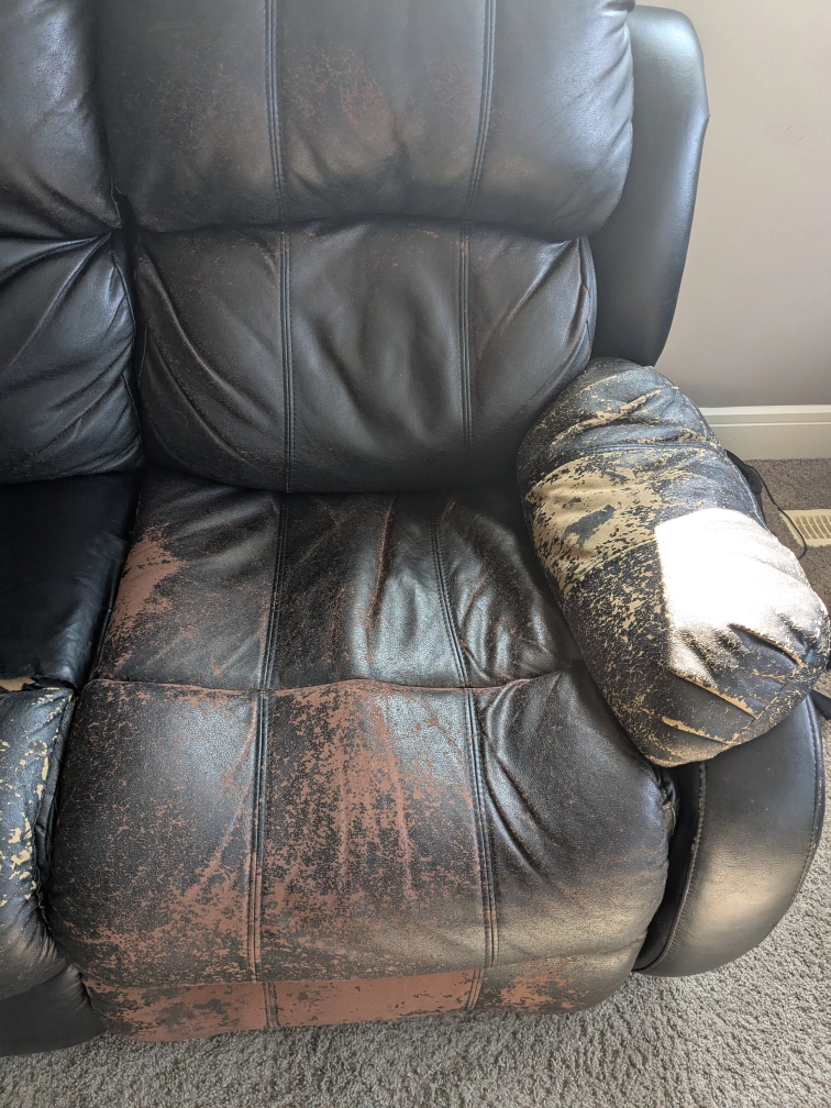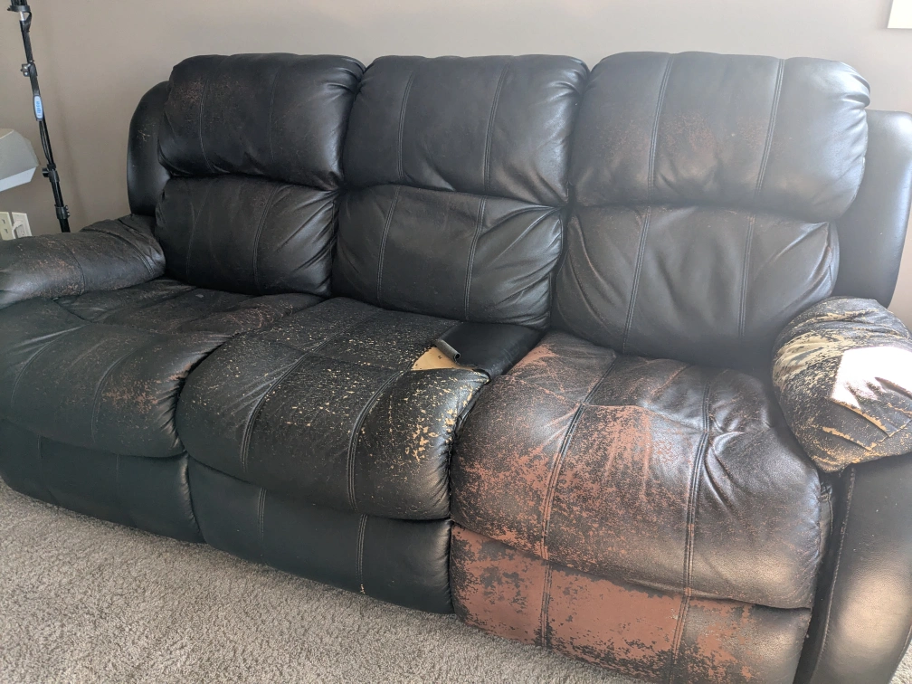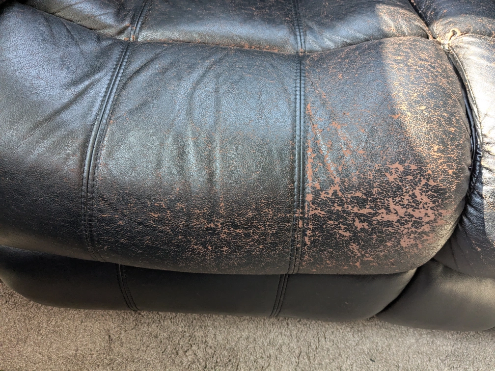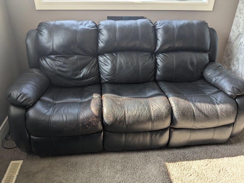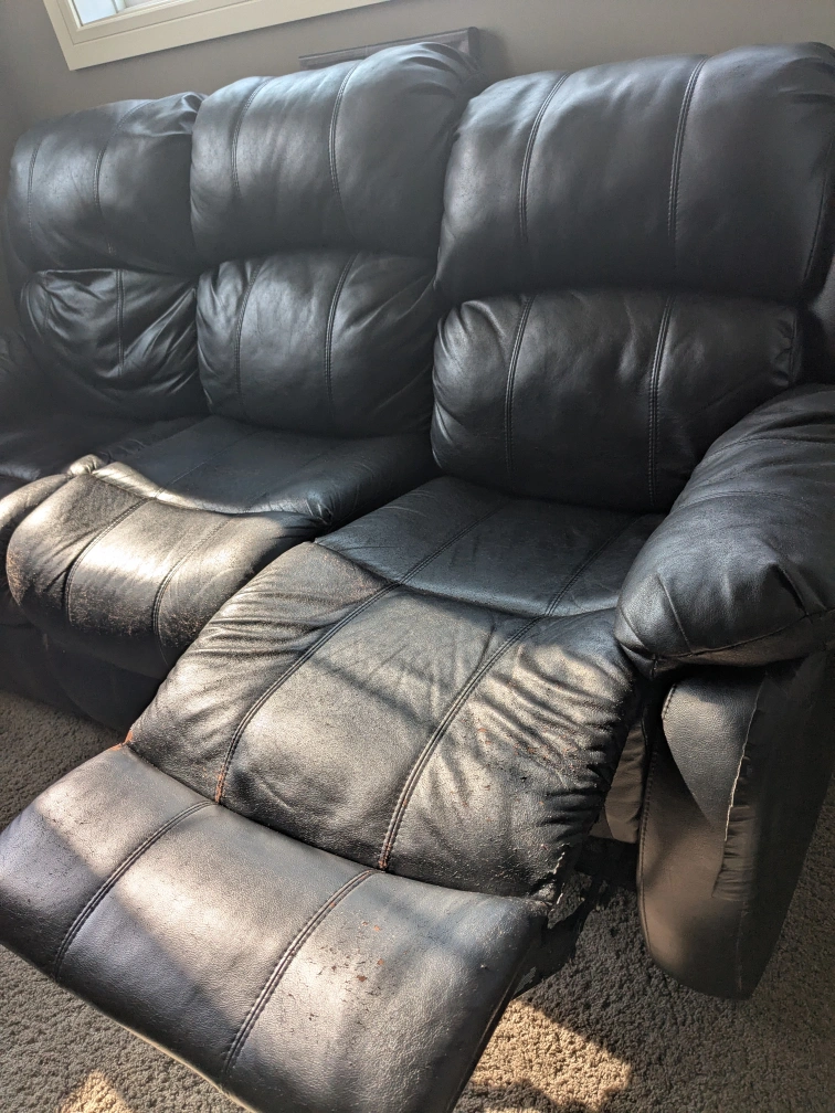 I'm giving away for free 2 black leather reclining sofas. It's a three-seater and shows significant wear and tear, with some peeling and discoloration on the seats and armrests. Still functional and comfortable, but definitely needs some TLC. it comes apart full easy moving. Pick up in Summerside