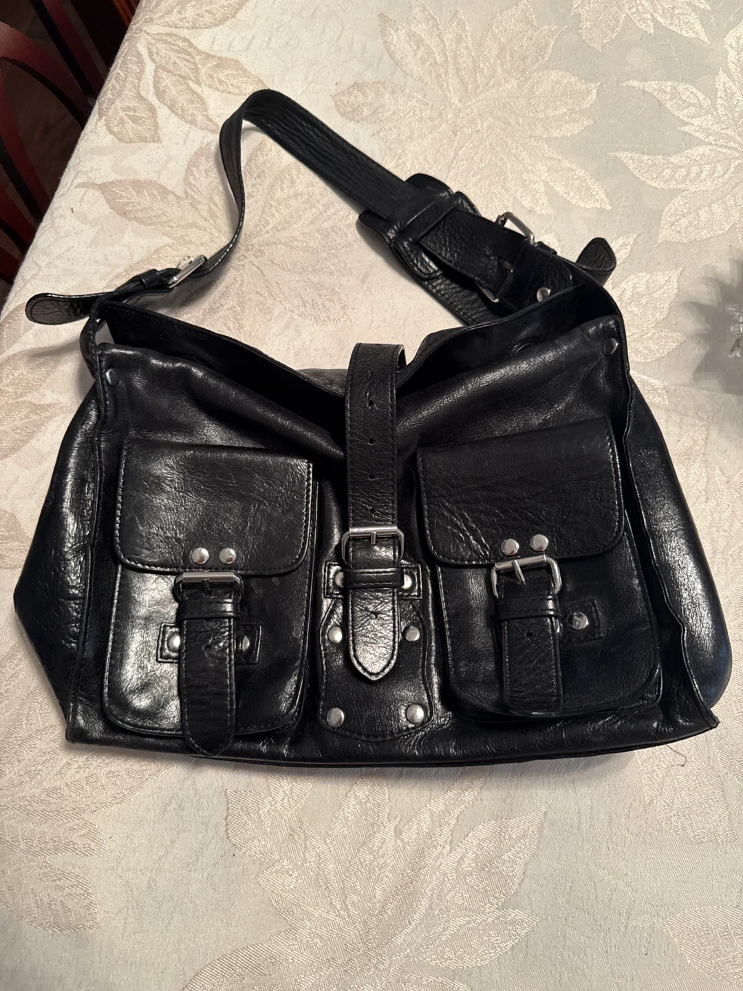 Selling a stylish black leather satchel bag! It features a classic design with multiple pockets and buckle details. Great for everyday use and adding a touch of sophistication to your outfit