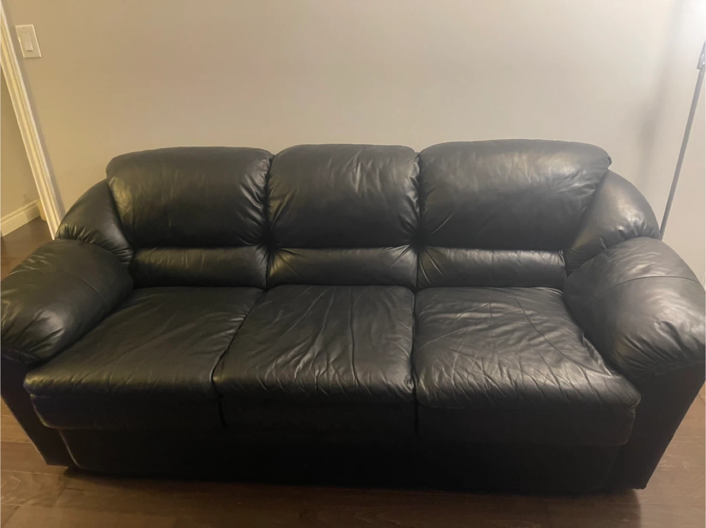 Selling a black leather three-seater sofa. It's in excellent condition and there are no rips or fading. It would be a great addition to any living room or den. The leather is soft and comfortable, perfect for lounging or entertaining!