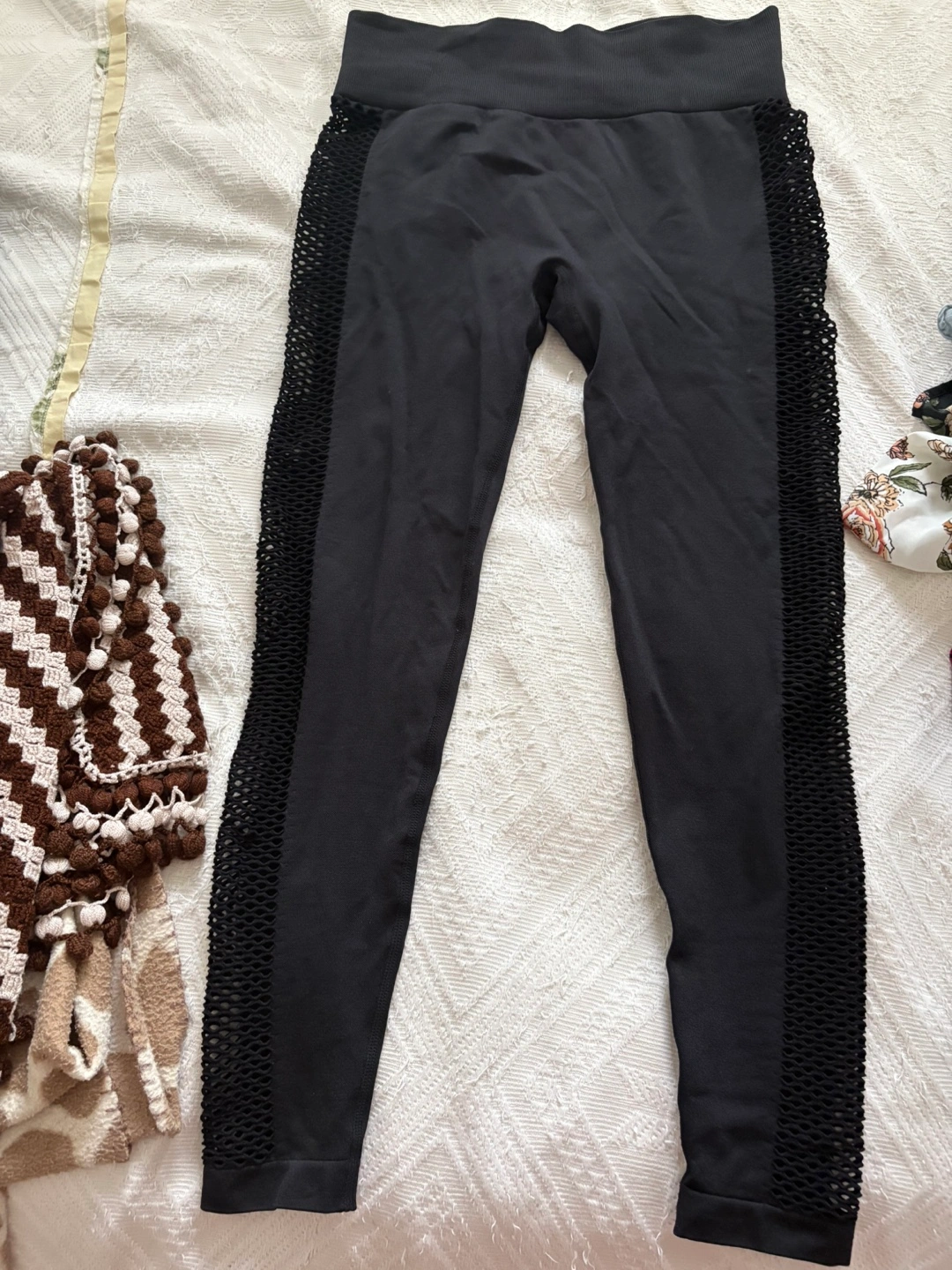 Selling a pair of black leggings with mesh detailing on the sides. They're in great shape and would be a stylish addition to your workout or casual wear! Never worn. Size Large..but fits like a Medium.