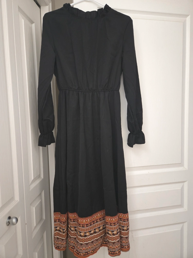 Selling a Modest black long sleeve dress. It has a beautiful pattern at the bottom. It's never been worn and ready for a new home. size Small