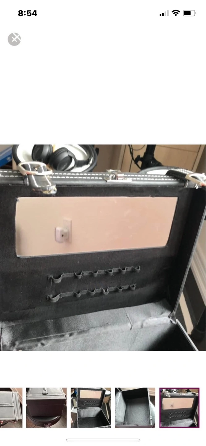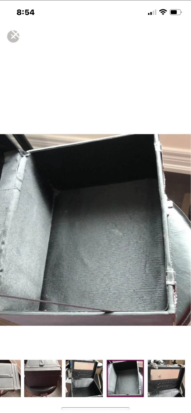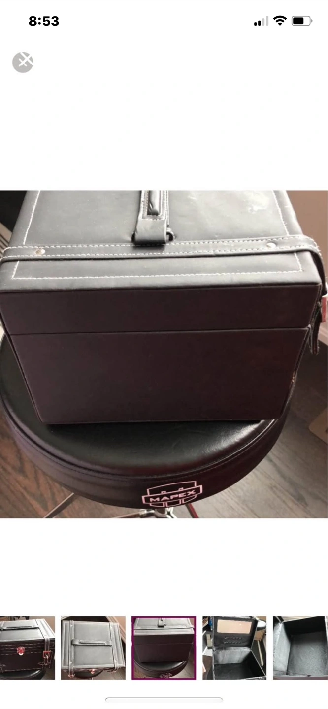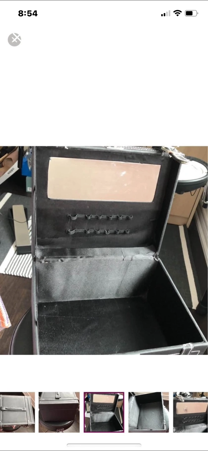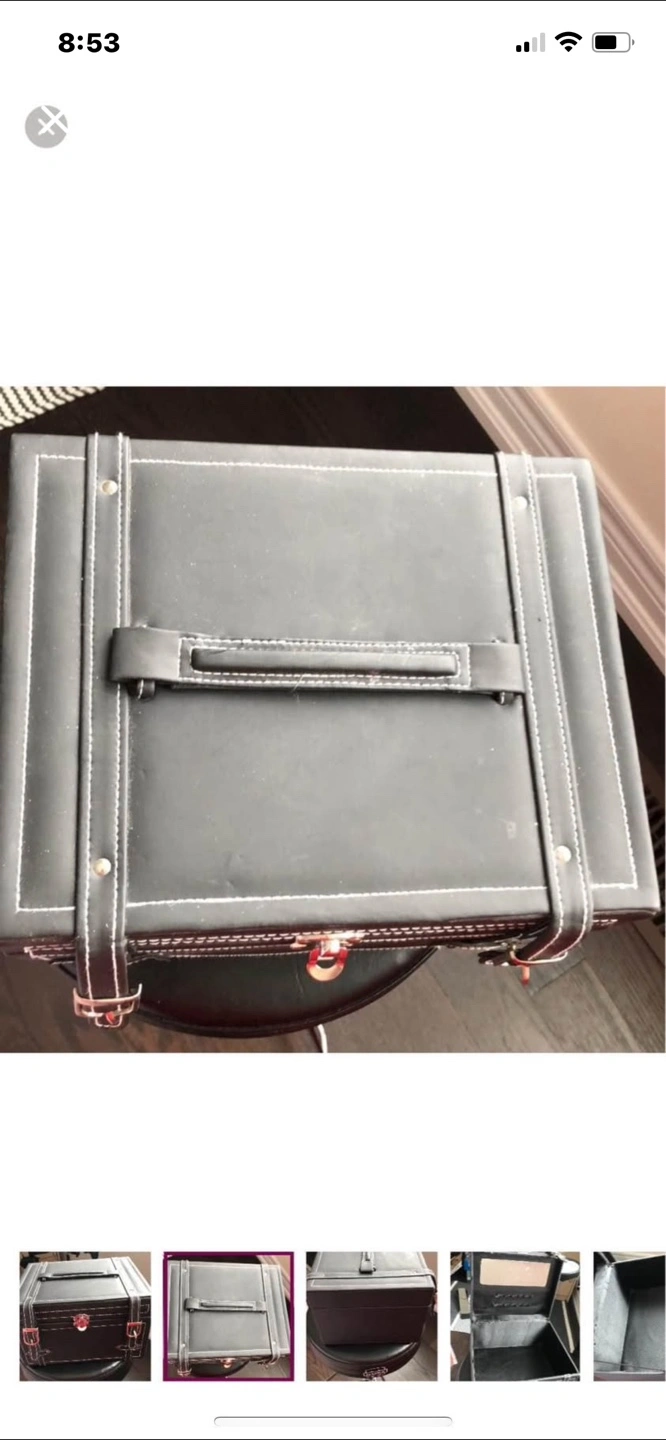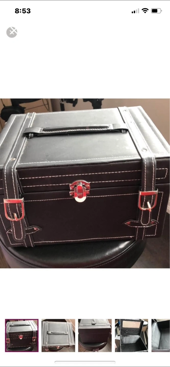 Makeup case with mirror. Has multiple compartments and straps. L: 10” , W: 8”, height: 6”