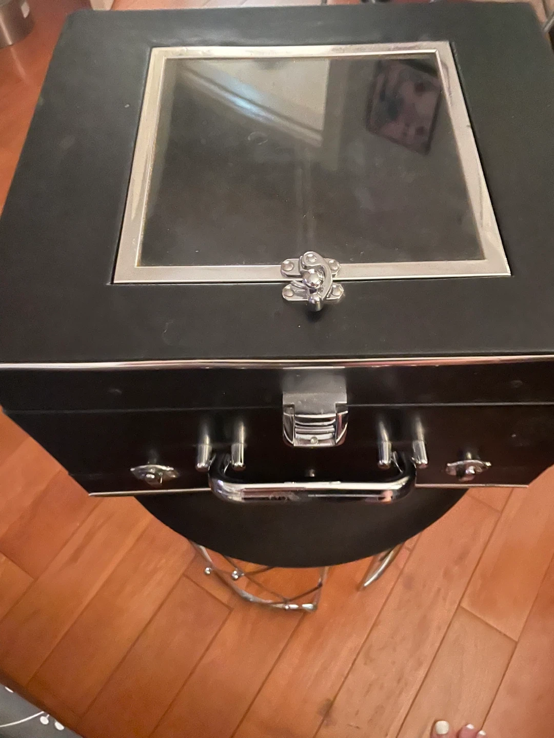 Selling a black makeup/jewelry organizer case. It has a handle for easy carrying and a mirrored lid. Inside, there are multiple compartments for storing your makeup or jewelry. It's in great condition and ready for a new home