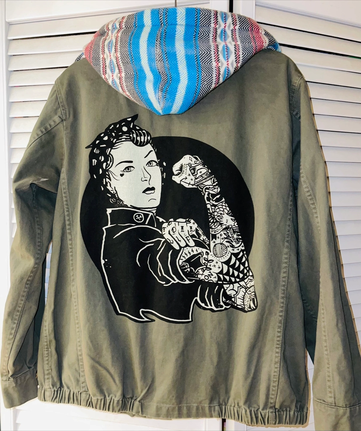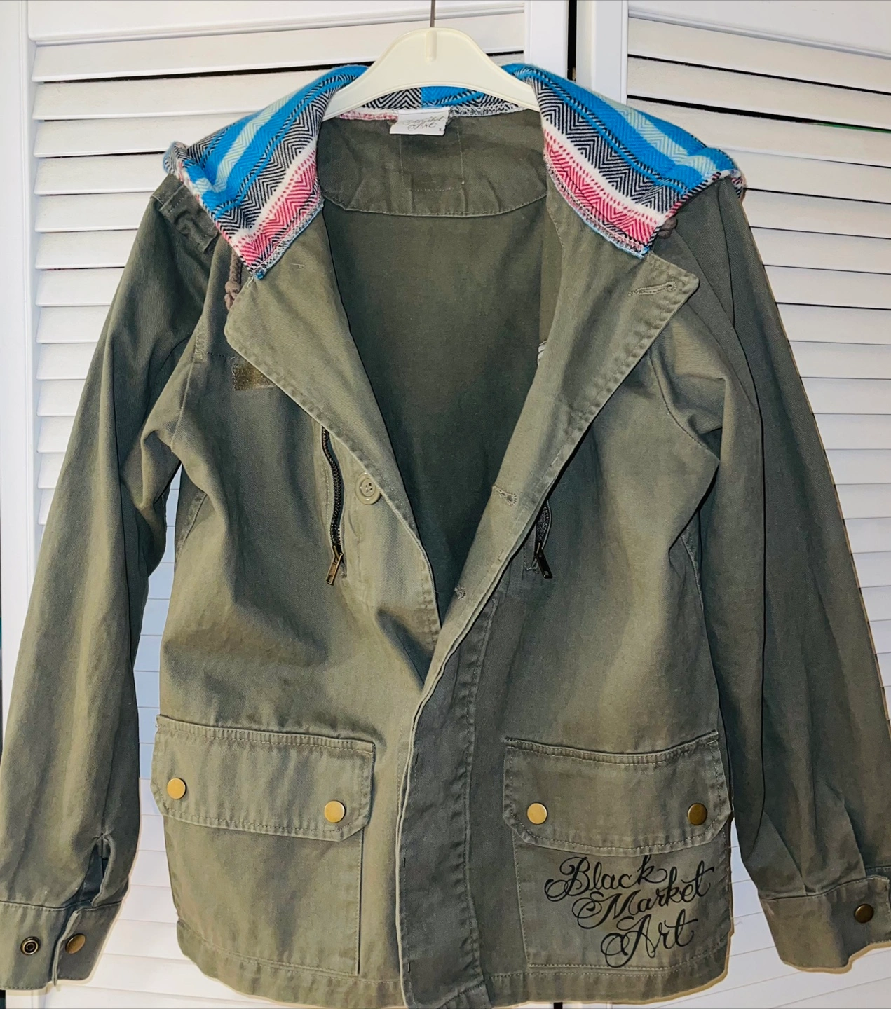 Selling a "Black Market Art" jacket in khaki colour. It's a size Large and features a unique design on the back and a colourful patterned hood. Perfect for adding some flair to your wardrobe!