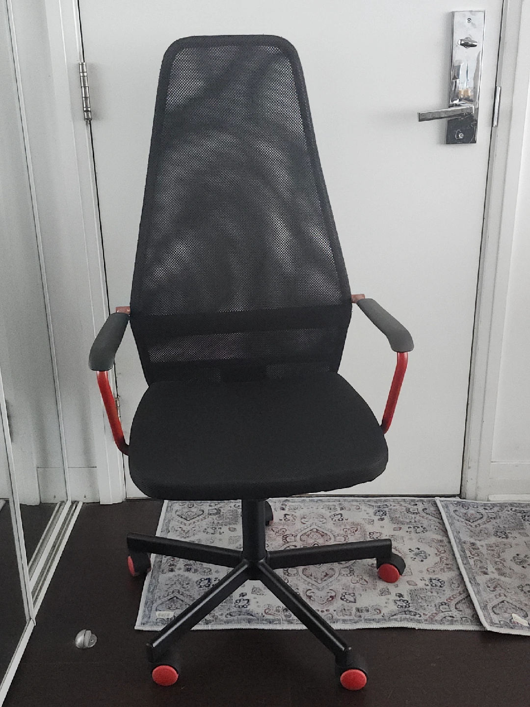 Selling a comfortable black mesh office chair. It features a high back and adjustable armrests for good support. The chair has a five-star base with smooth-rolling casters, making it easy to move around your workspace. Great for home or office use!