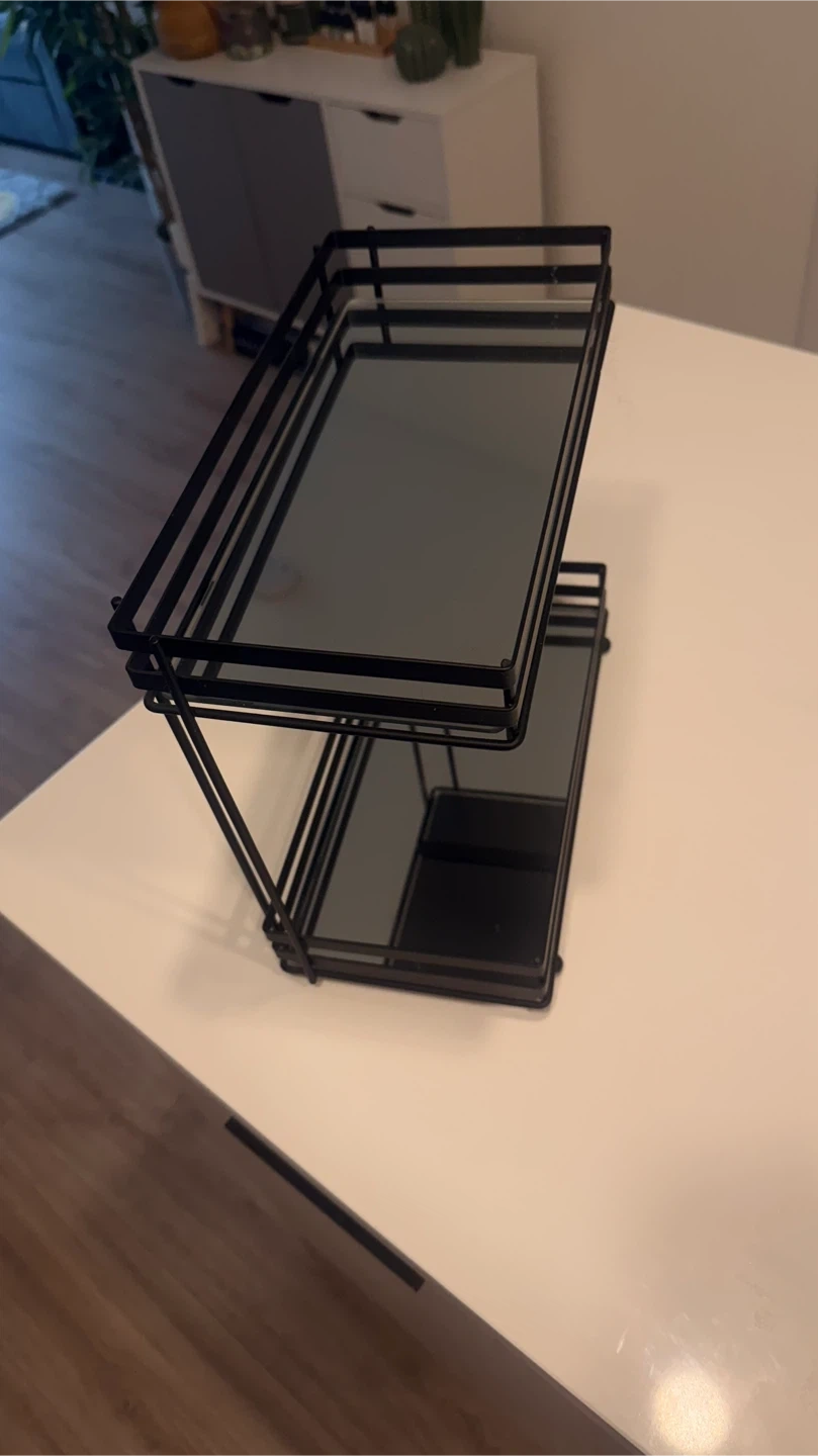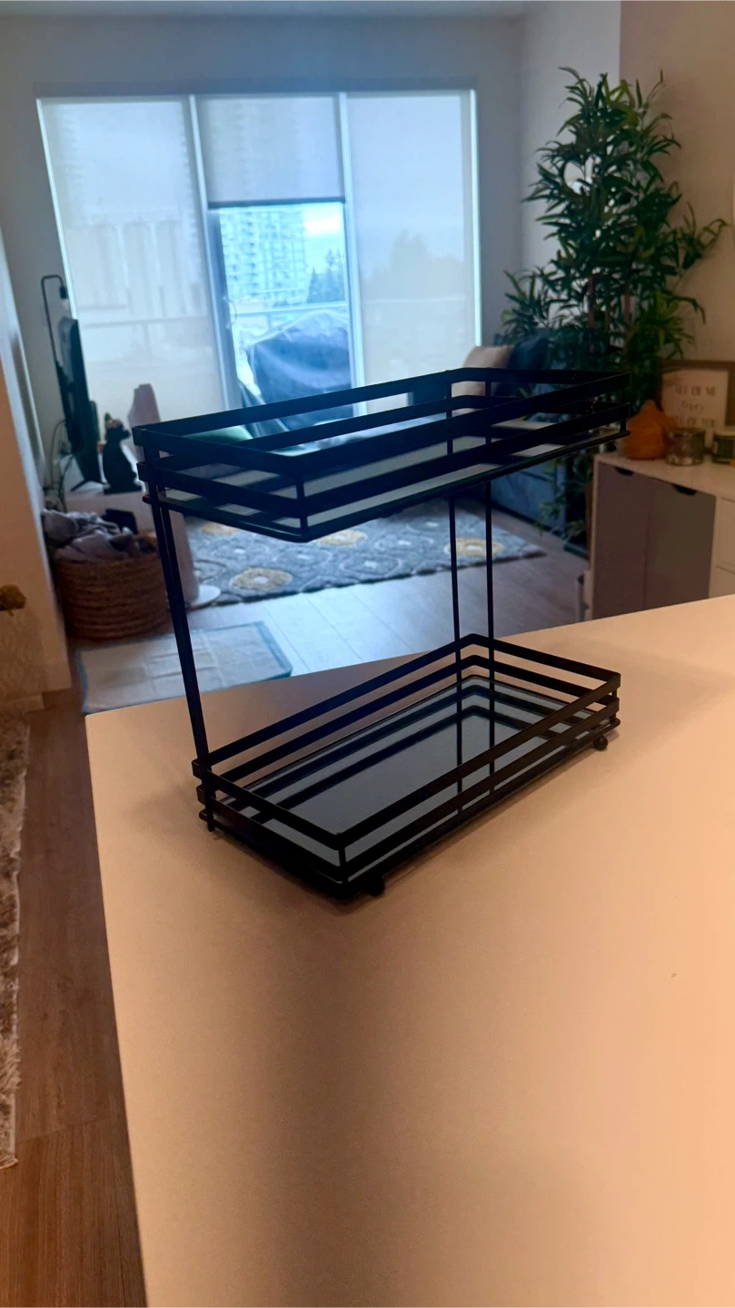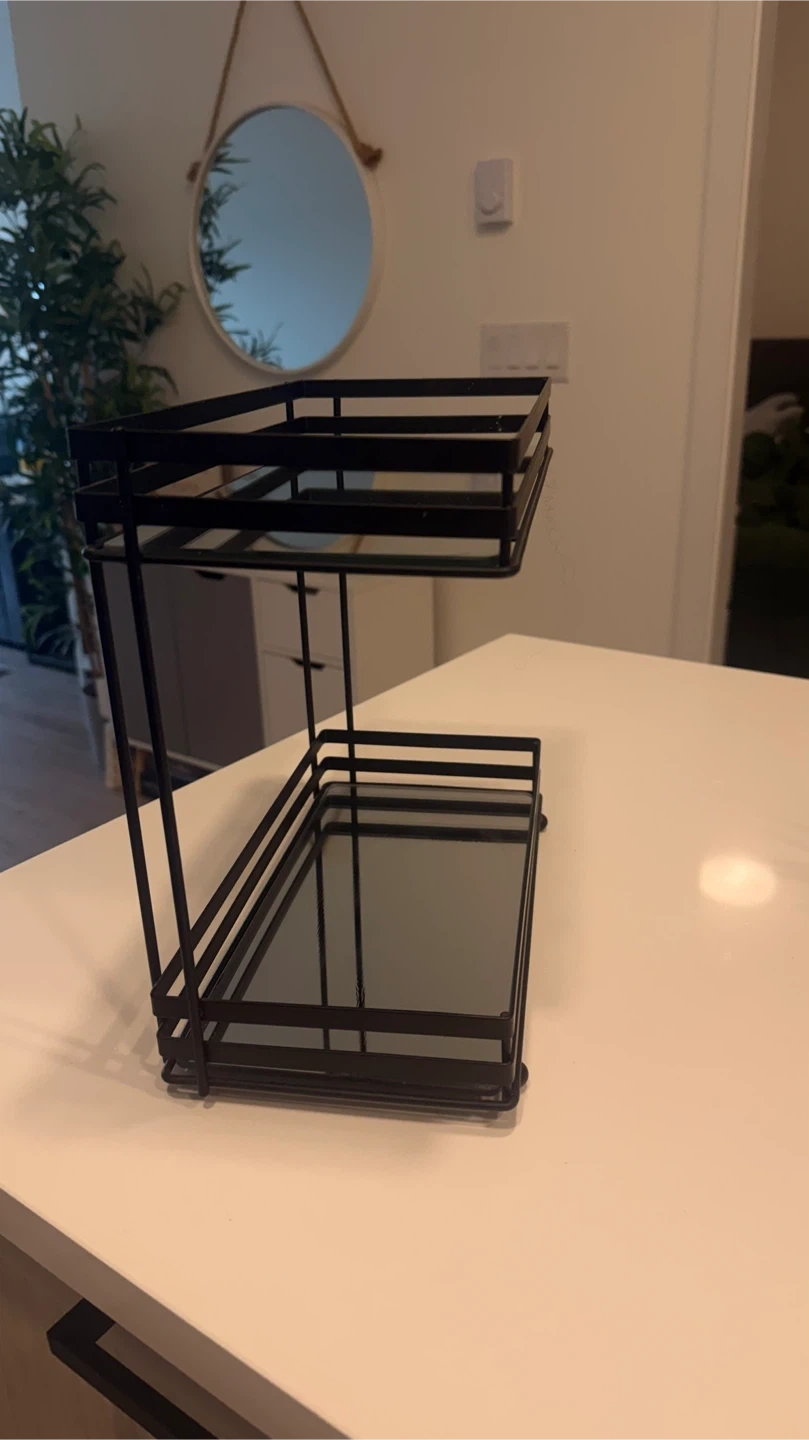 Selling a handy black metal two-tier organizer! It's perfect for adding some extra storage in the kitchen, bathroom, or anywhere you need a little more space. It's in great shape and ready to go to a new home.