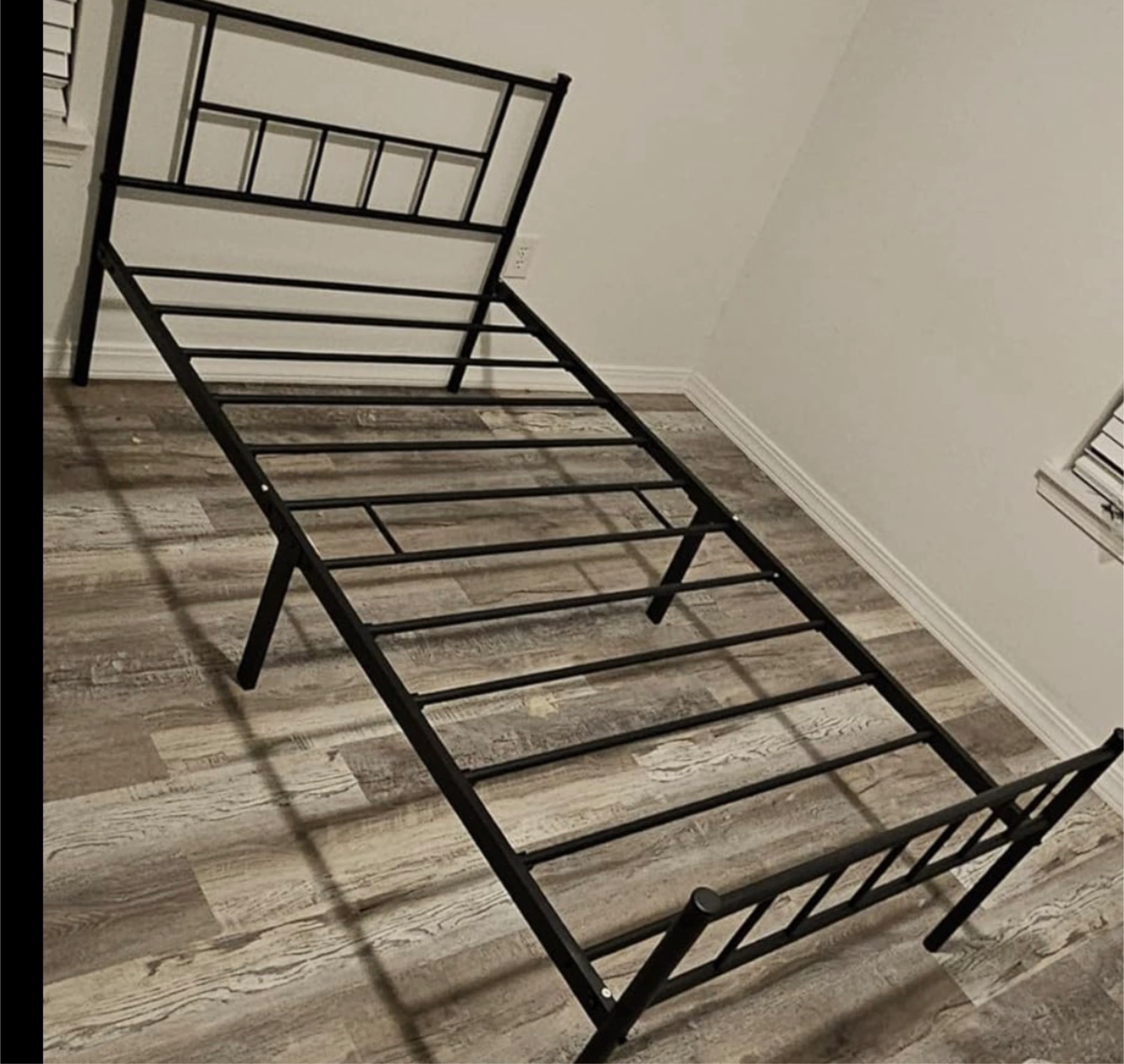 Selling a twin-size bed frame. It's a simple black metal frame that's easy to assemble and disassemble. Perfect for a small space or a guest room!