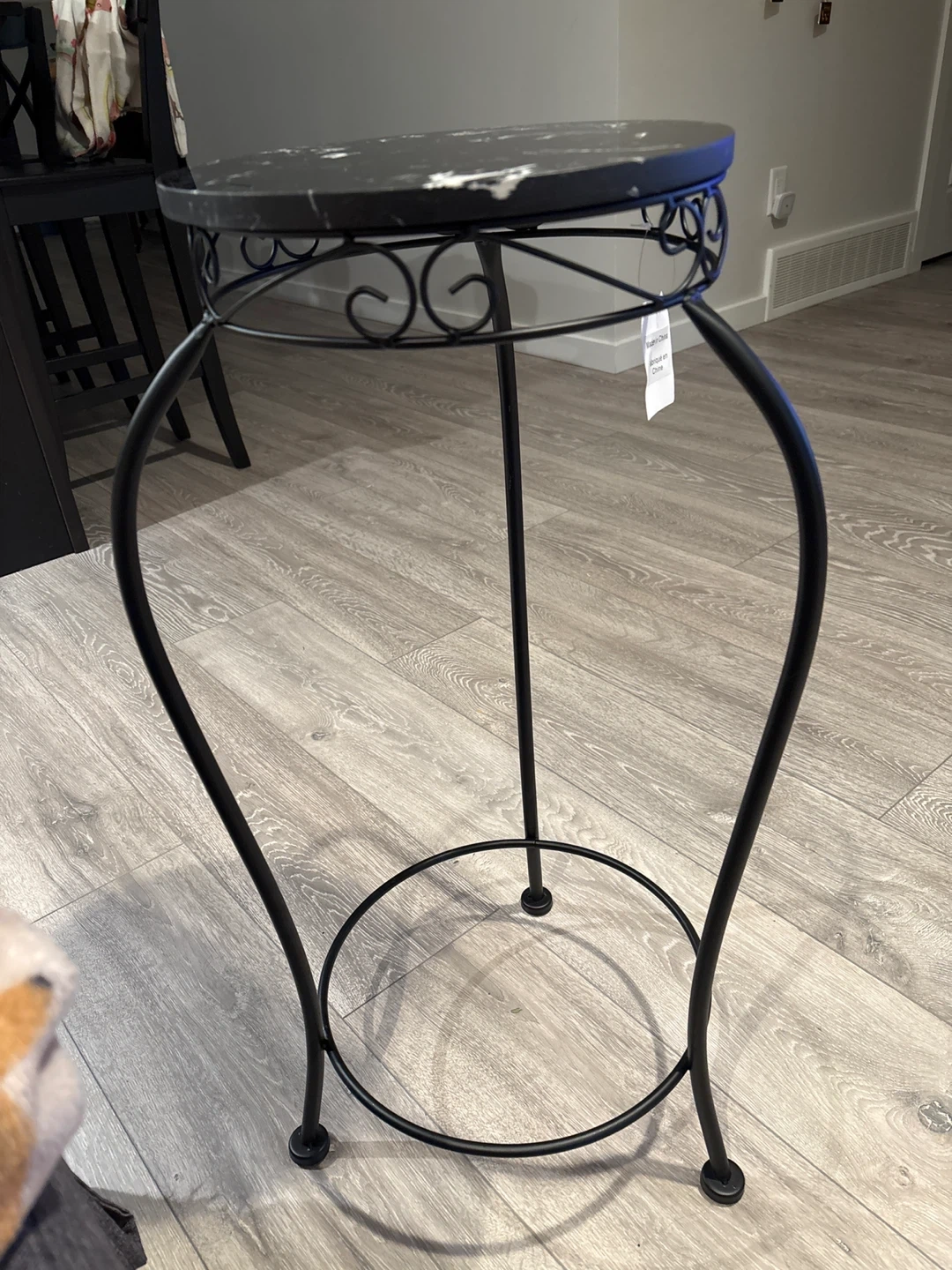 Selling a lovely black metal plant stand with a faux marble top. It's in great shape and ready to display your favourite plant! The stand has a decorative wrought iron design and a sturdy base. Perfect for adding a touch of elegance to any room