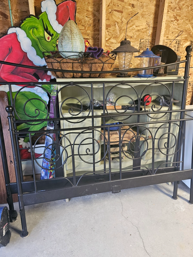 A stylish, decorative, swirling metal design. Perfect for creating a serene bedroom sanctuary. No rails available, but center beam, and slats included. Sorry, unable to deliver, but open to reasonable offer. ๐