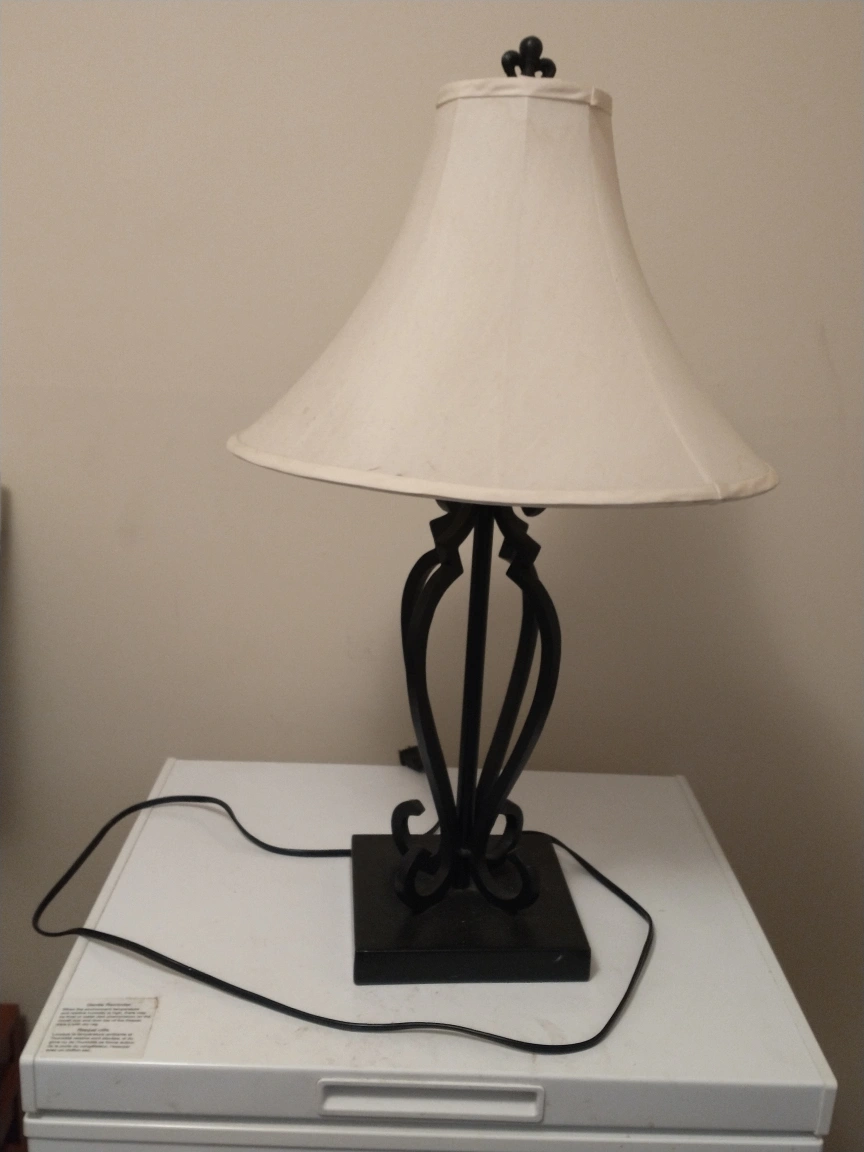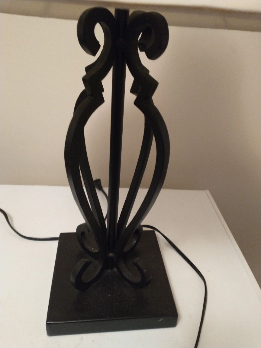 BLACK METAL SCROLL WORK TABLE LAMP, CREAM SHADE. IN EXCELLENT CONDITION. REGULAR PRICE UP TO $200. APPROXIMATELY 28 INCHES TALL, SHADE WIDTH APPROXIMATELY 14 INCHES WIDE.