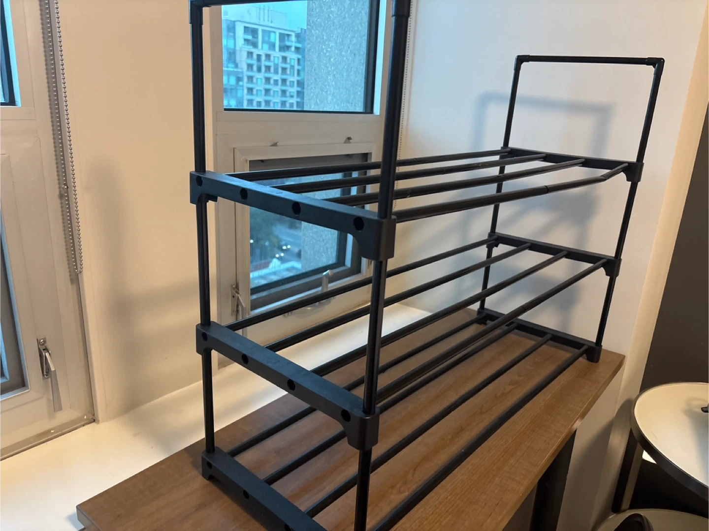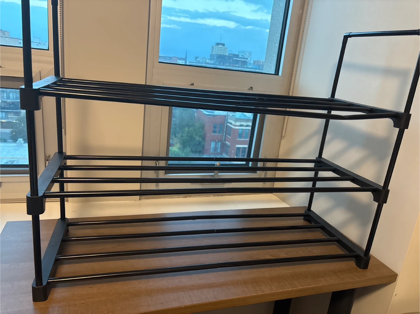 Here's a sturdy black metal shoe rack that's perfect for keeping your entryway or closet organized! It's in great shape and ready to hold all your favourite footwear. It's easy to assemble and disassemble, making it convenient to move or store when needed