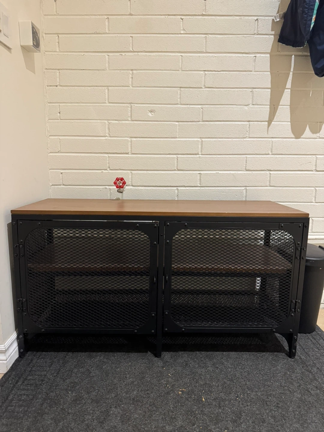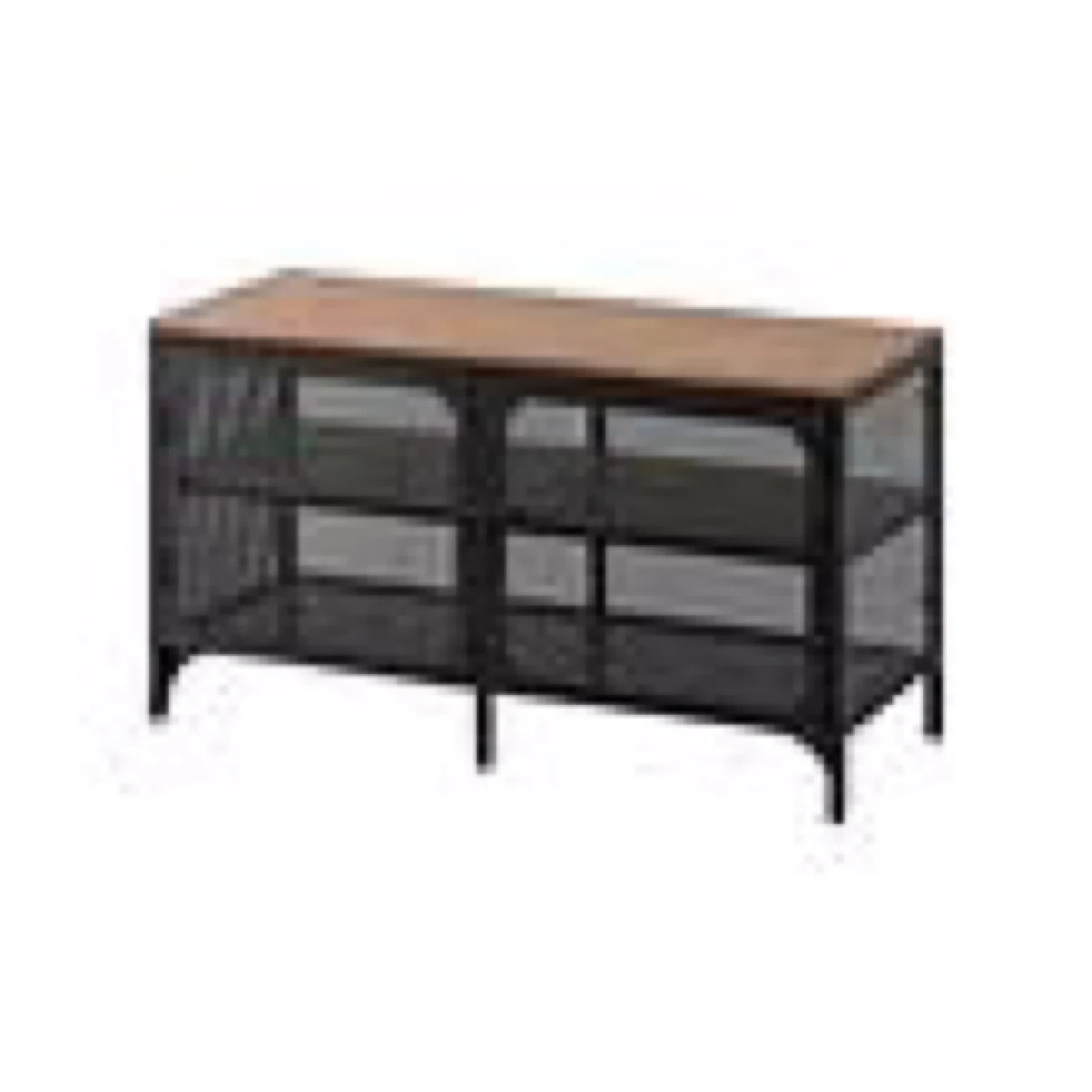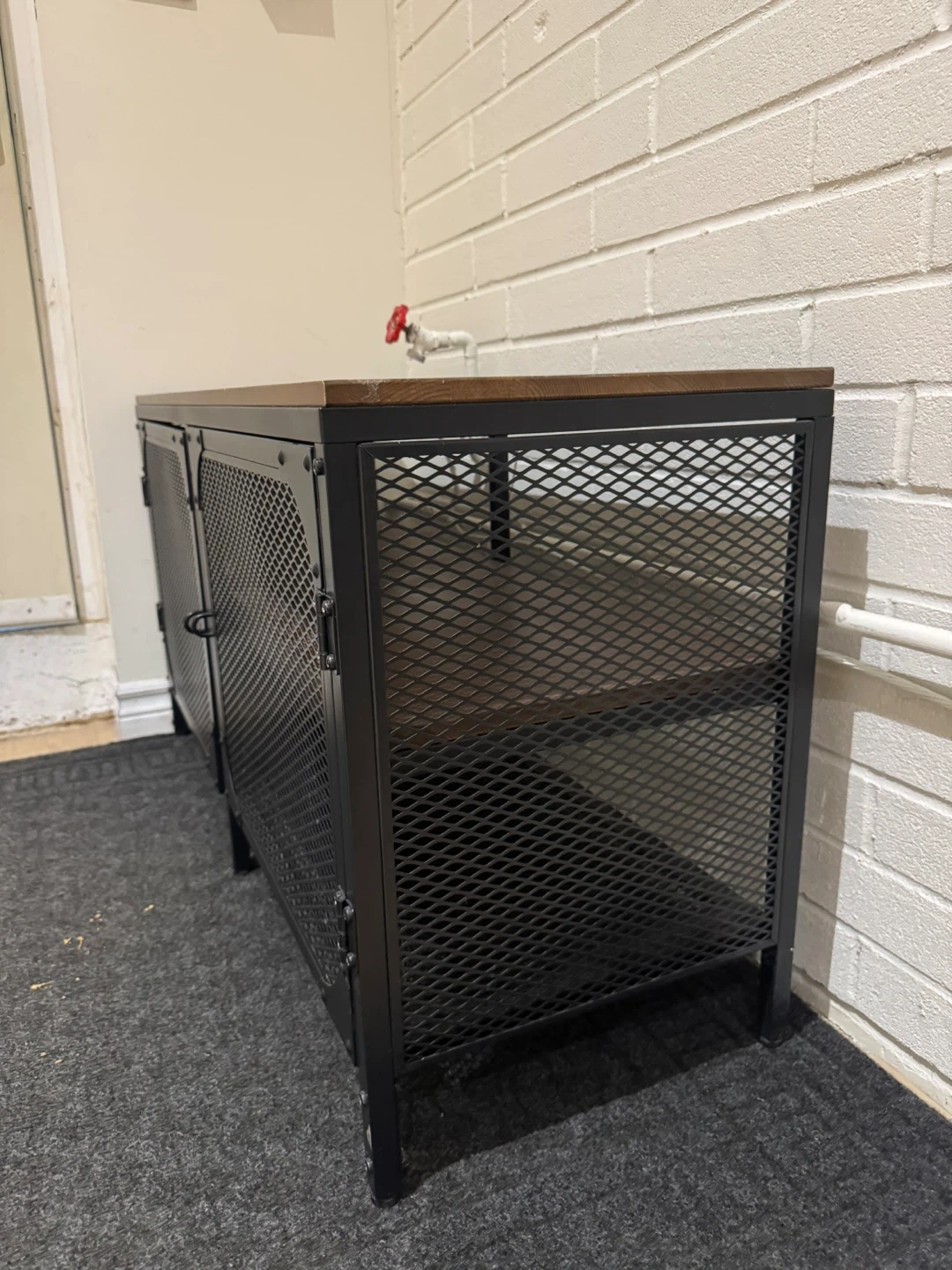 IKEA FJÄLLBO TV Bench (150x36x54 cm) Industrial-style TV stand with metal mesh doors and wood top. This model is no longer available on the IKEA website, making it harder to find. Great chance to get a stylish and rare piece for your home!