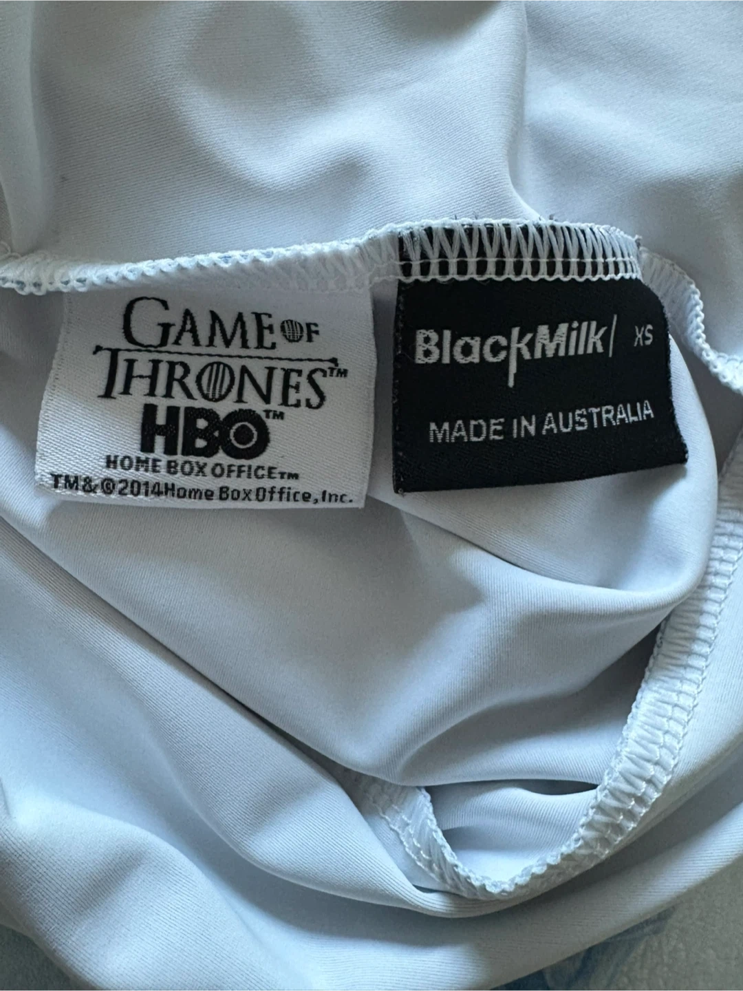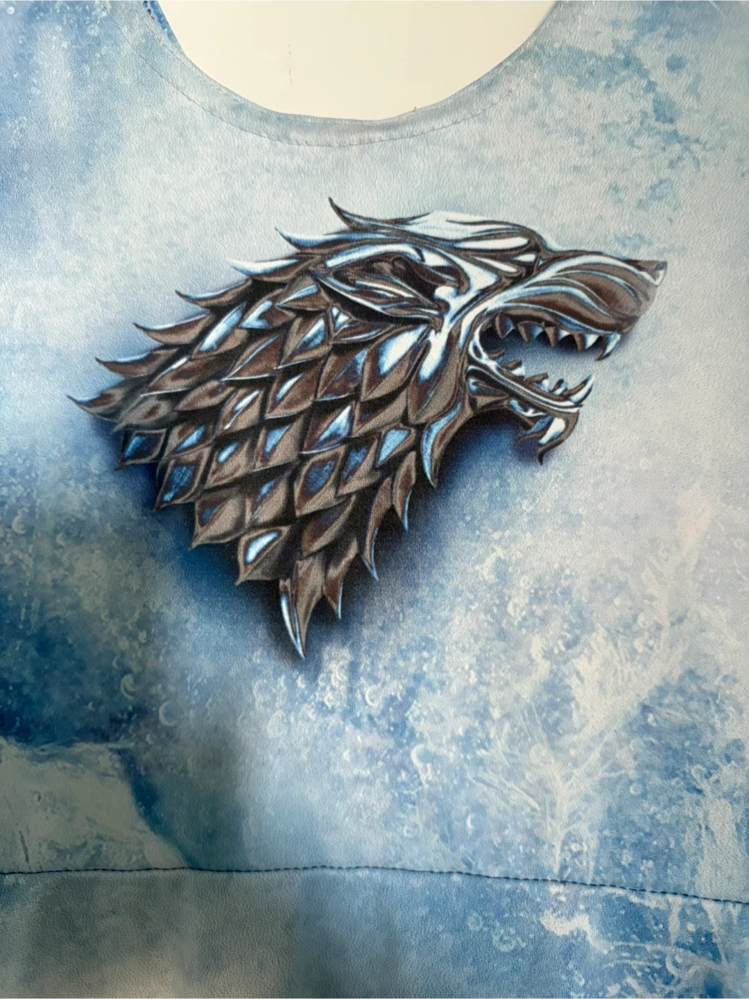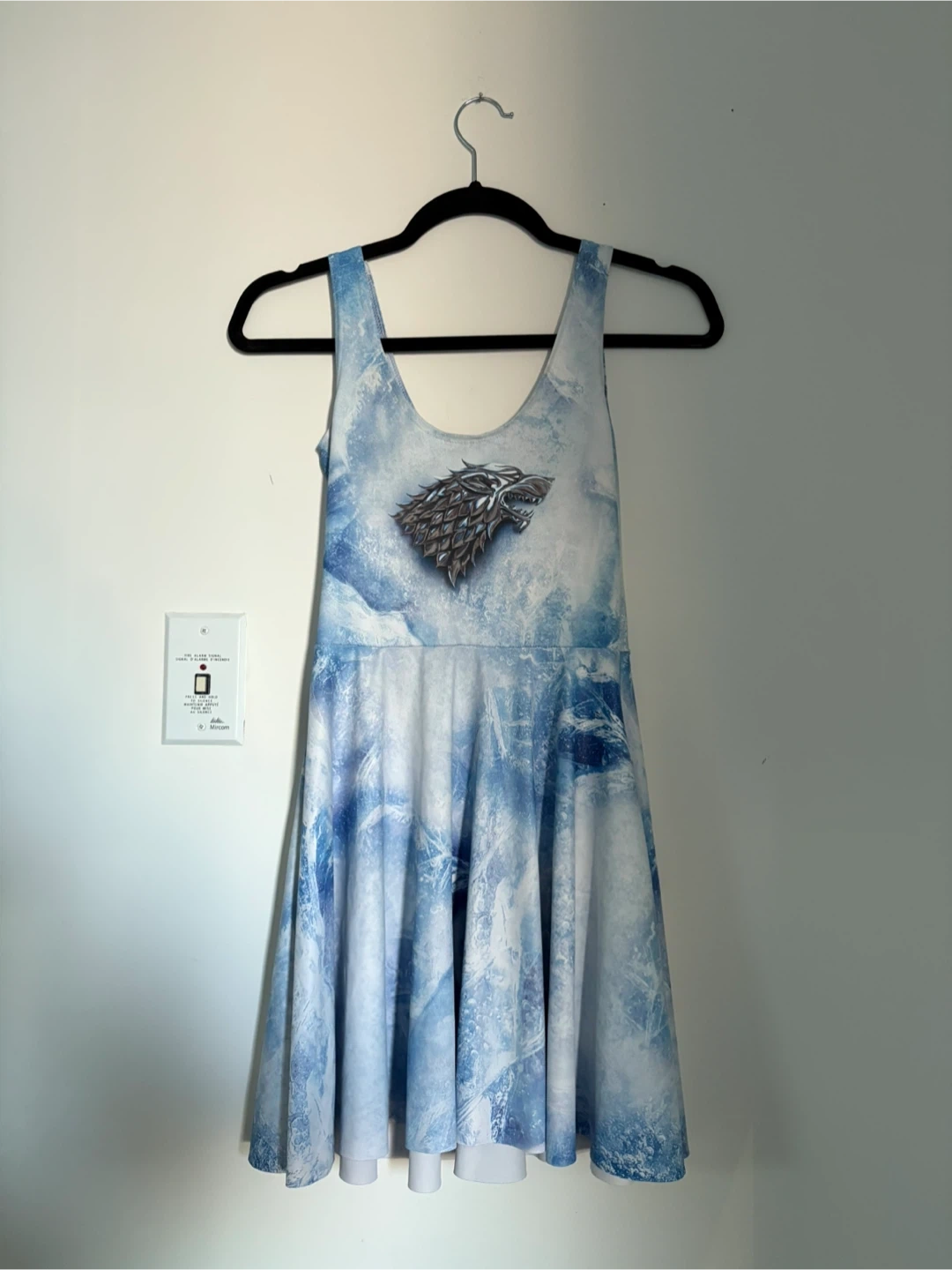 Selling a Black Milk Game of Thrones Mini dress, featuring the Stark sigil. It's a size XS and in great condition minus the small black stain pictured (it's near the bottom of the skirt). Scoop neck.