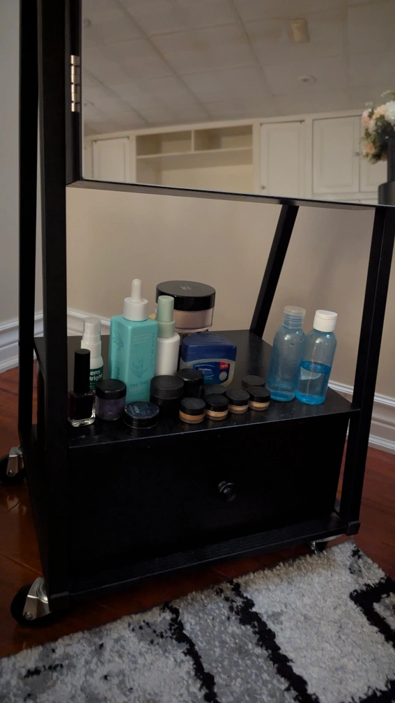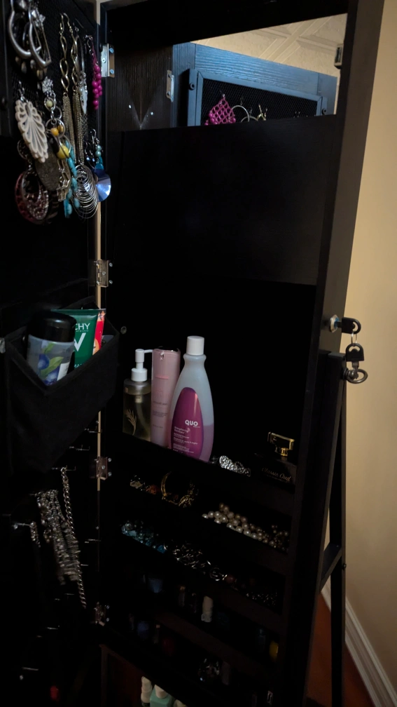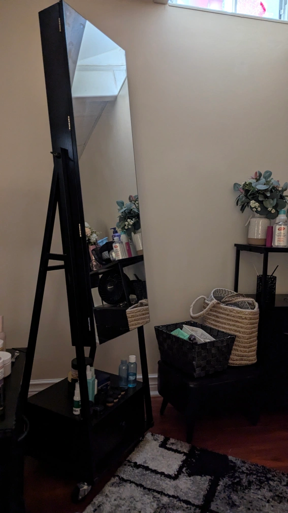A tall black mirror. Features shelves, a drawer, and wheels for mobility. Inside, there is storage for jewellery and other beauty products. This organizer would be a great way to create a calm morning routine.