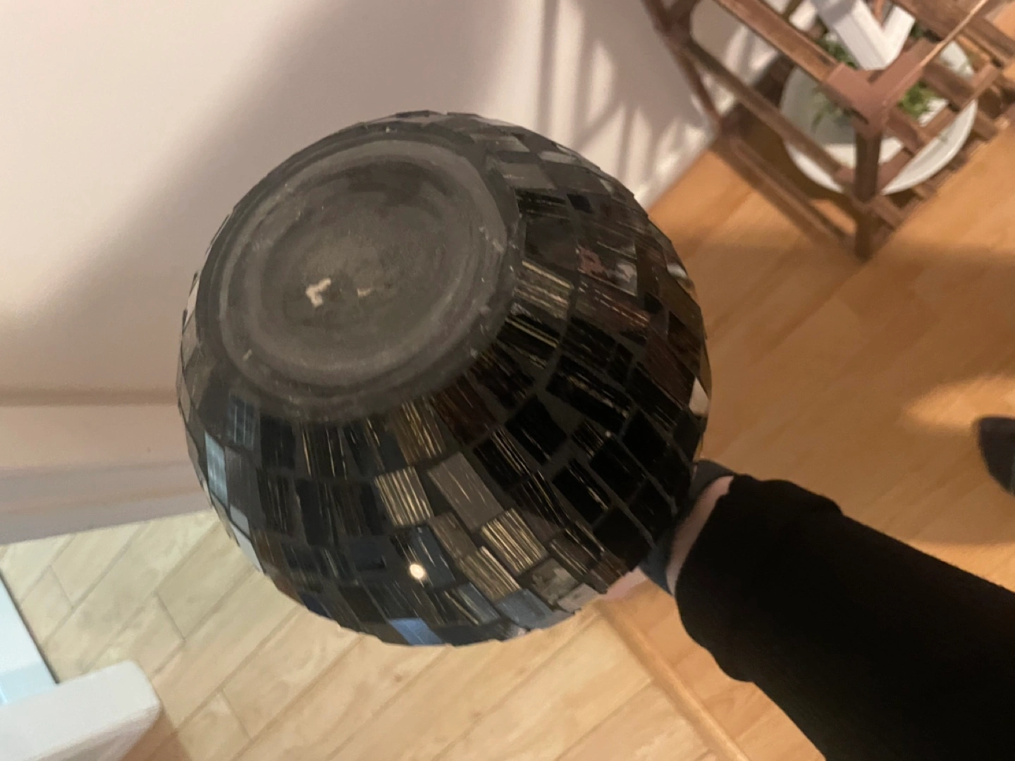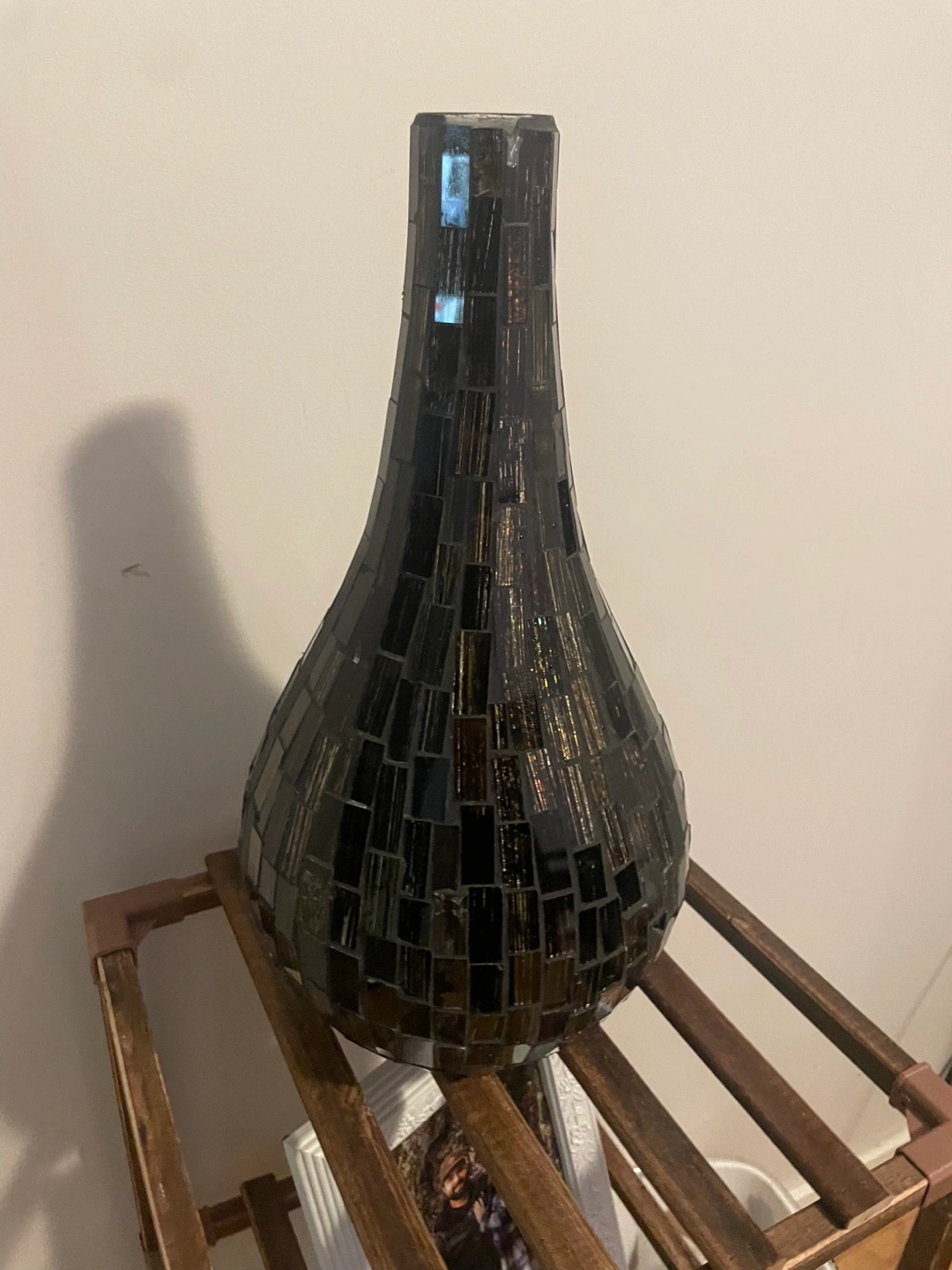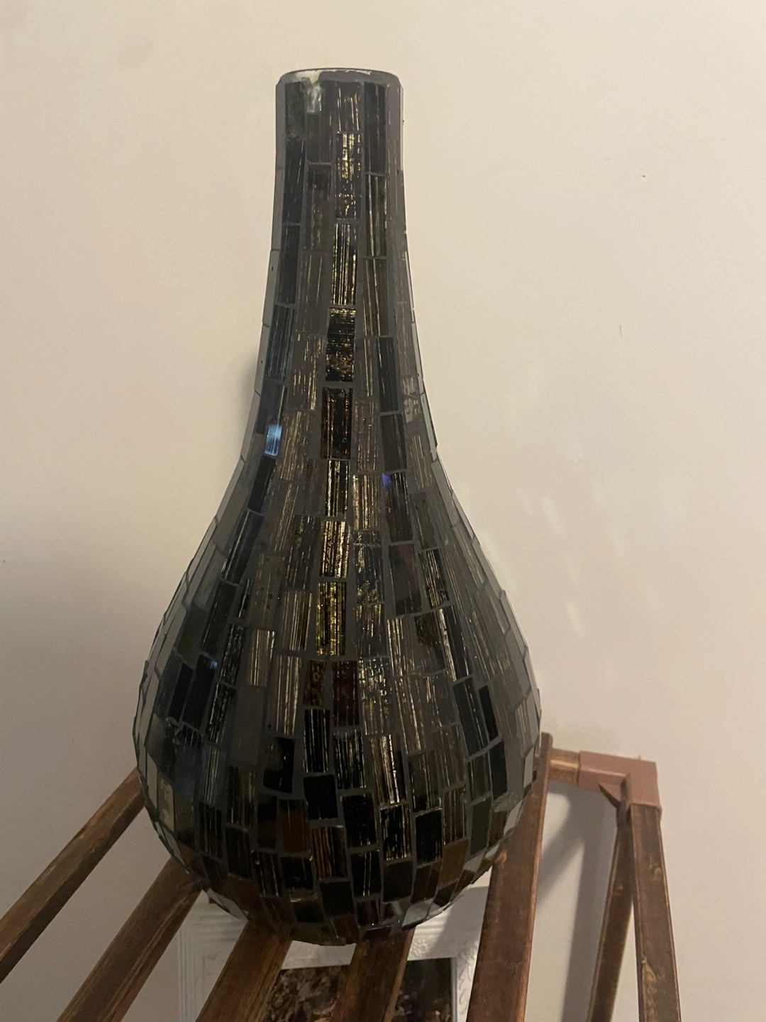 Beautiful black mosaic glass vase. Elegant design. Perfect for home décor. Adds a touch of sophistication.