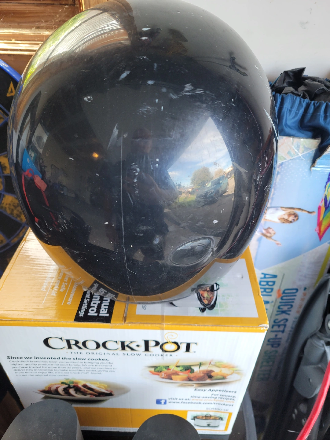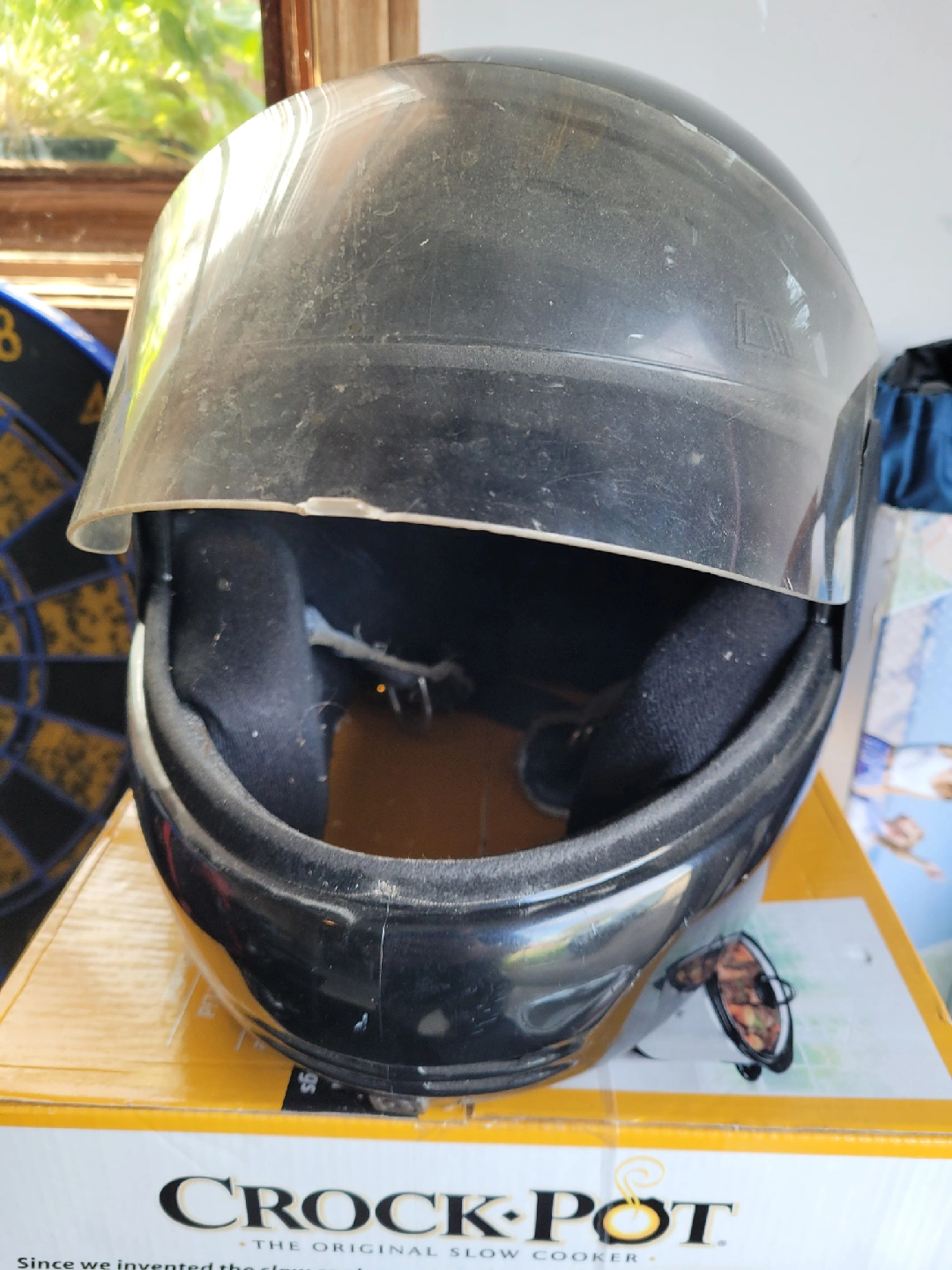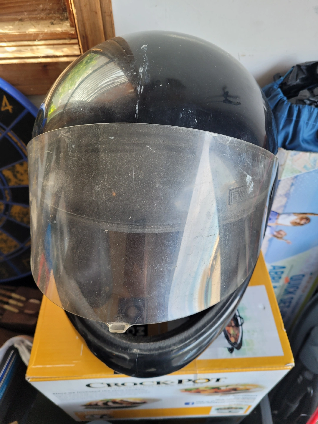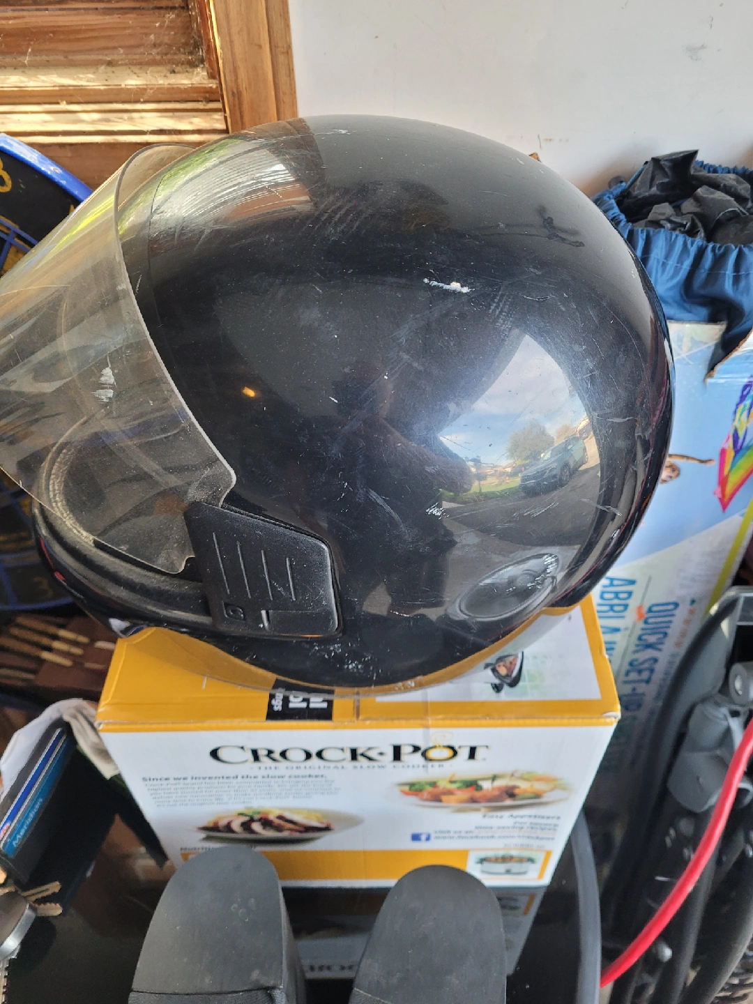 Selling a black motorcycle helmet. It shows some signs of wear and use, with some scratches visible on the surface. Please take a look at the photos for details!
