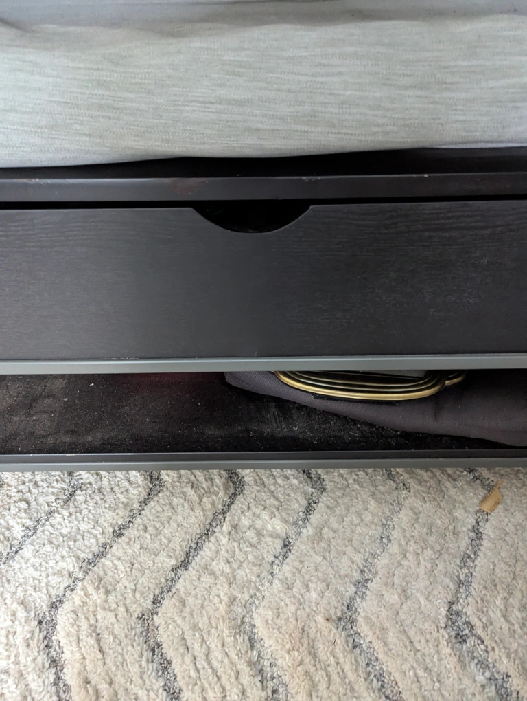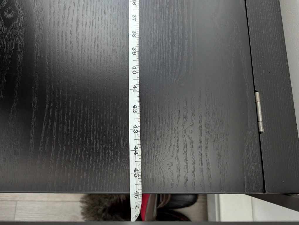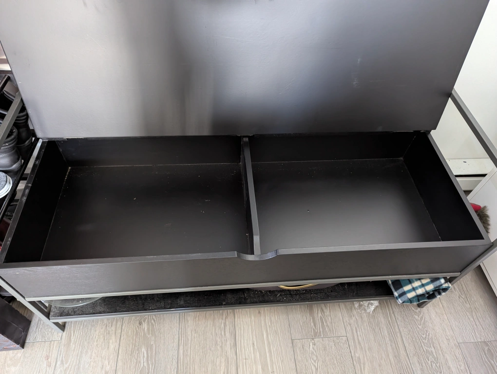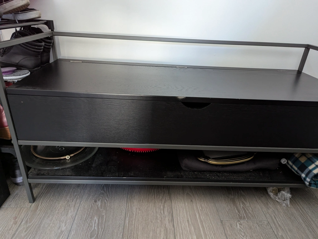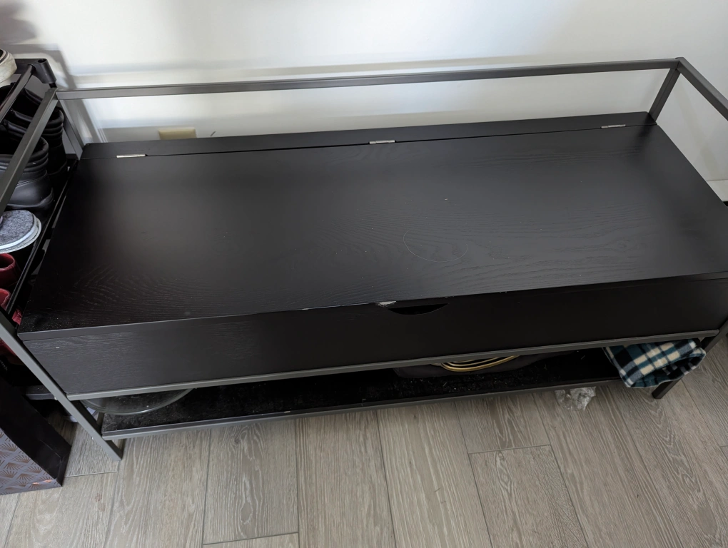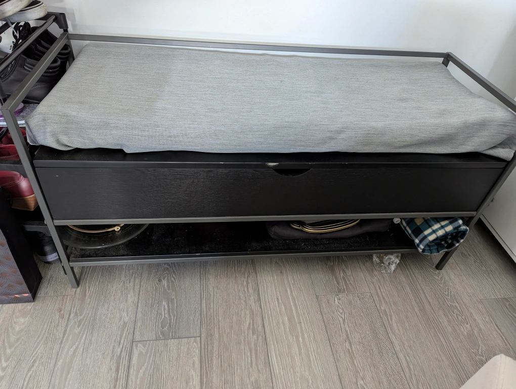 dark brown black storage bench that's about 46 inches wide! It's great for storing shoes or other items near the entrance of your home. It has a lift-up top seat for easy access to the storage space inside. I made a cushion with fabric and memory foam for a small small extra fee if you want