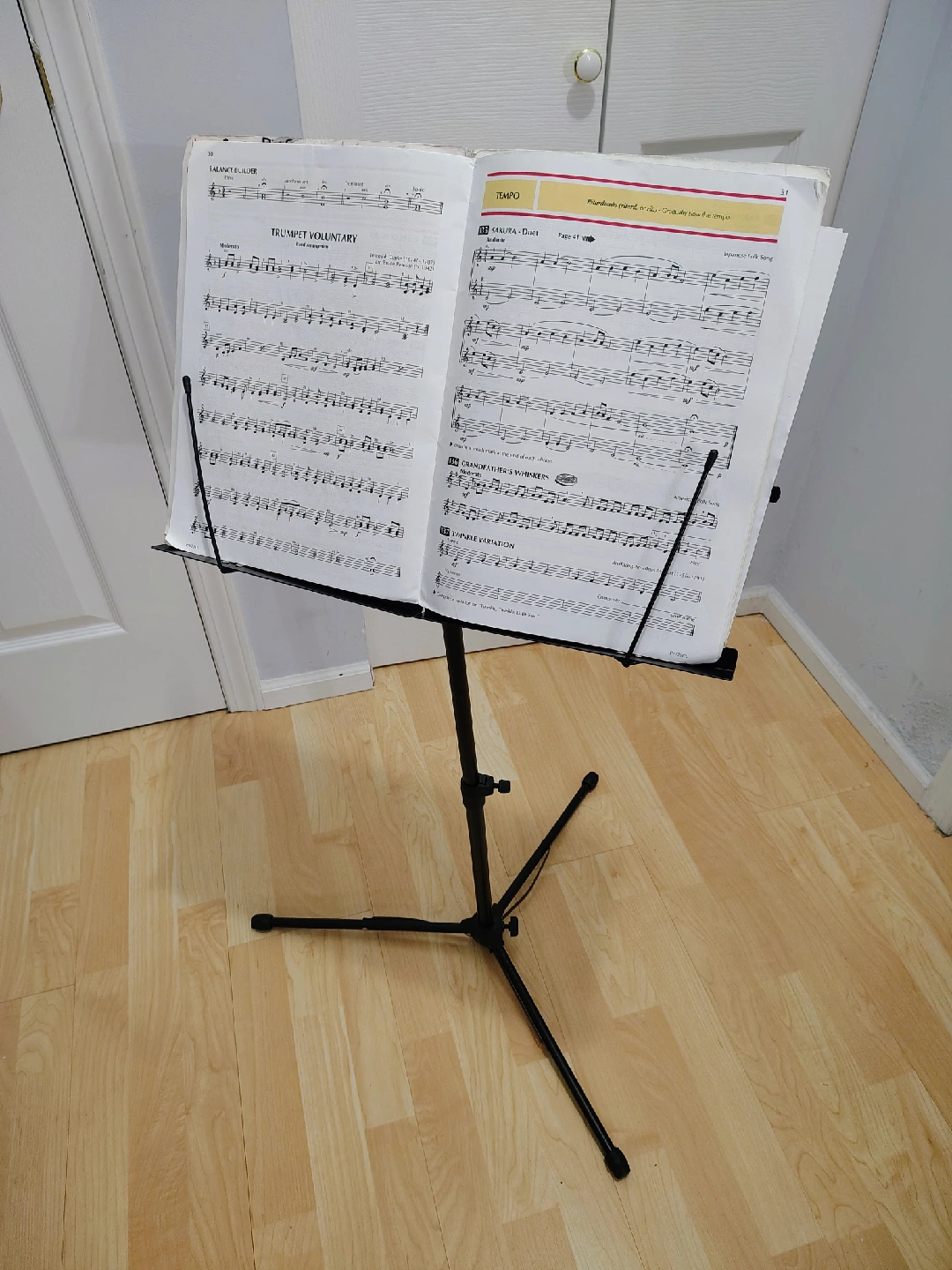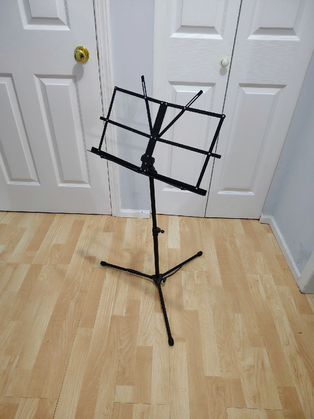 Here's a handy music sheet stand that's perfect for musicians! It's black and comes with a convenient carrying bag, making it easy to transport to rehearsals or performances