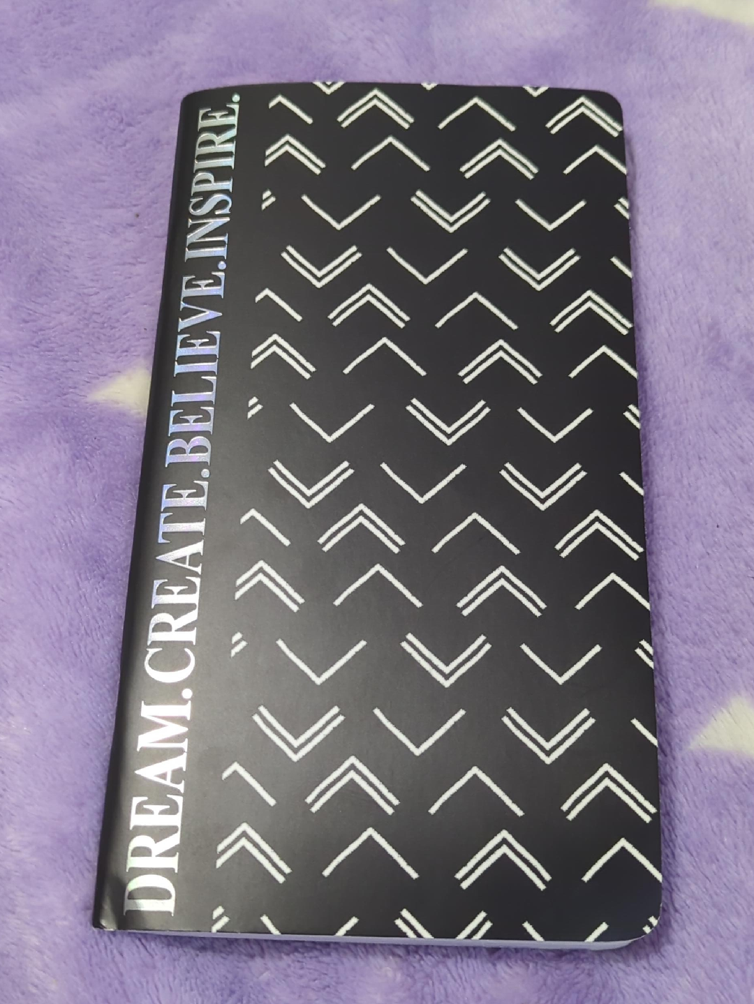 A sleek black notebook with a modern geometric pattern! The cover features the words 'Dream, Create, Inspire' along the spine. Perfect for jotting down notes, journaling, or sketching on the go