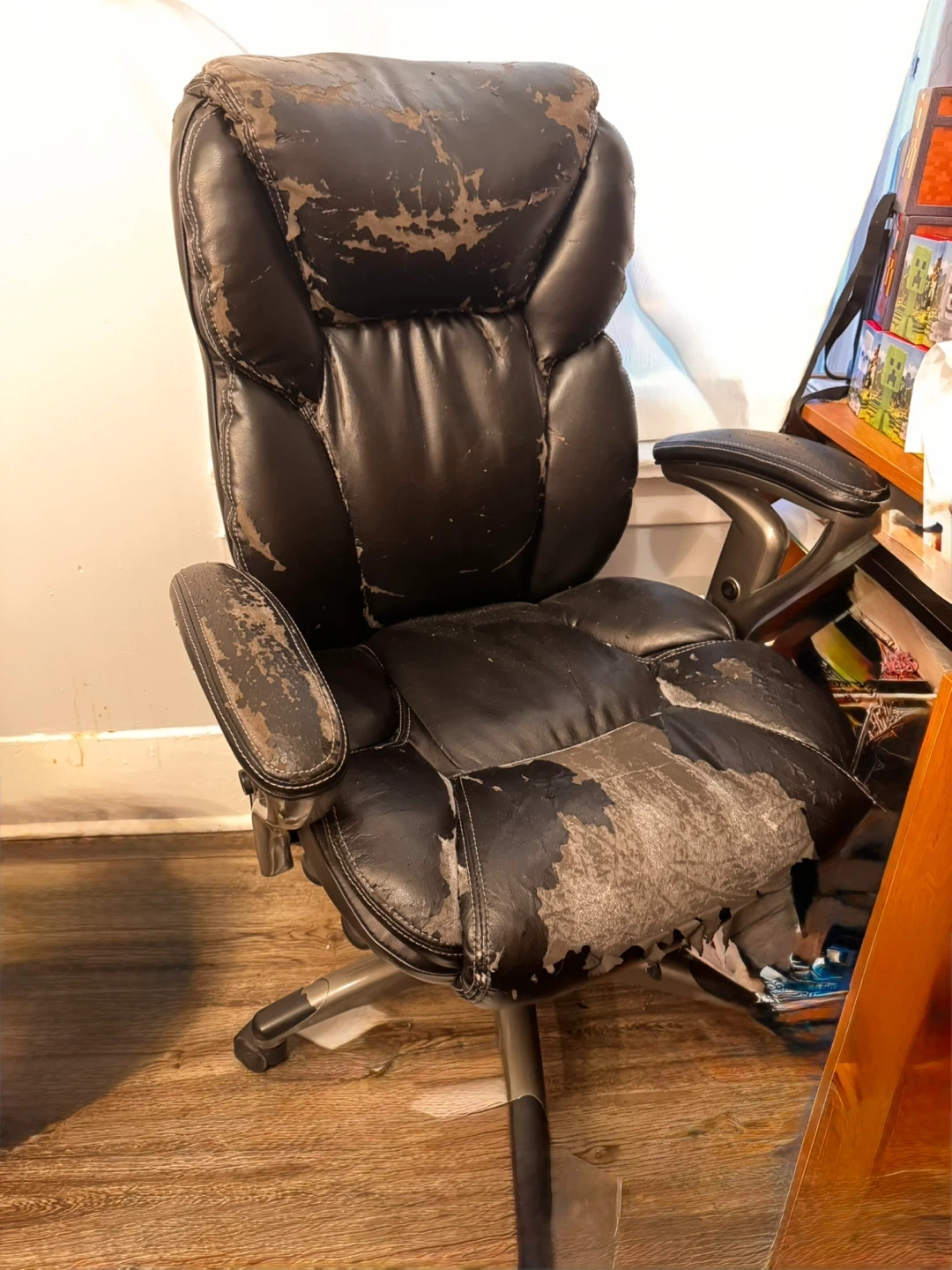 All the adjustments, up and down, front and back, are working perfectly. The cover is just peeling. A cover would fix that. It's still very comfortable.
