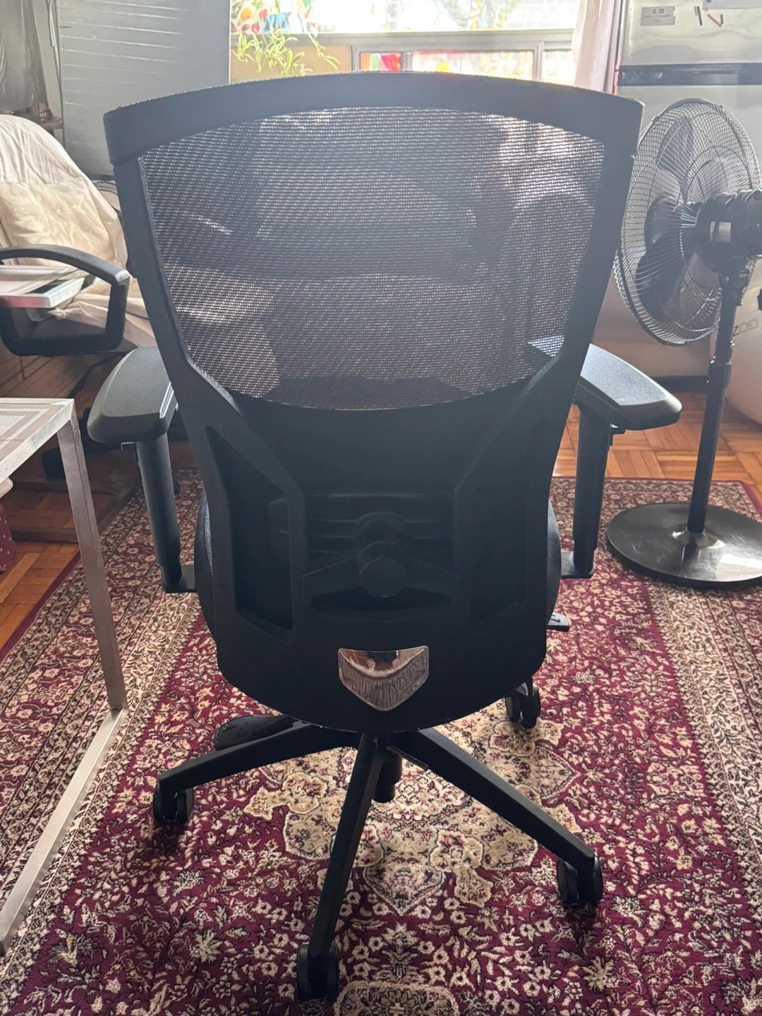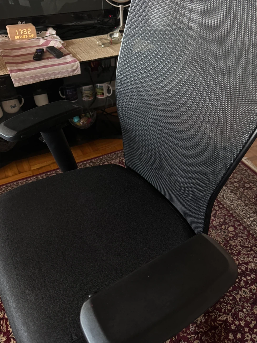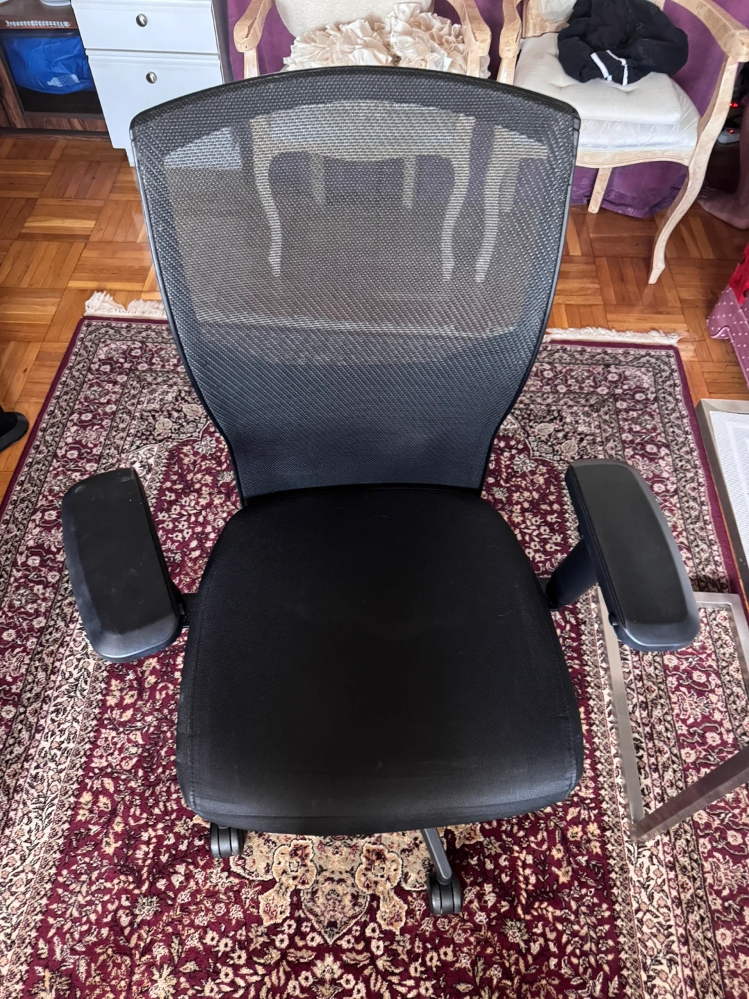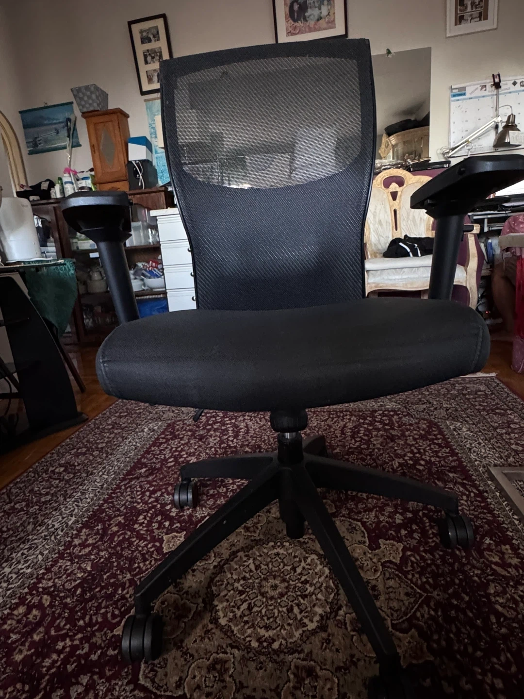 Selling a comfortable black office chair! It's in great condition and perfect for working from home or studying. The chair features a mesh back for breathability and adjustable armrests for added comfort. It's a great addition to any workspace!